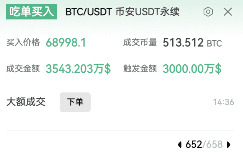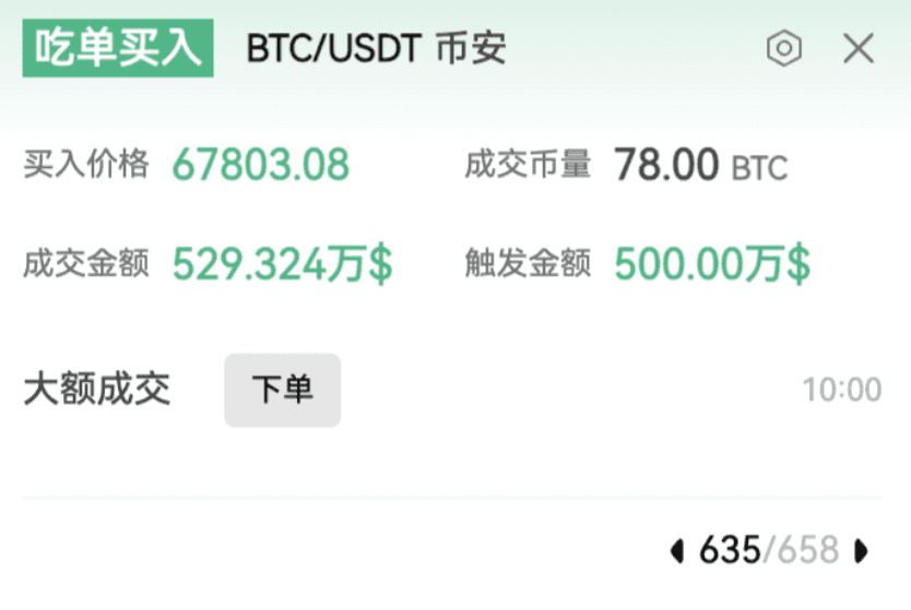If you had set up a large transaction alert in advance, the PC and APP would prompt you at the first time; this is today’s latest buy order alert.
