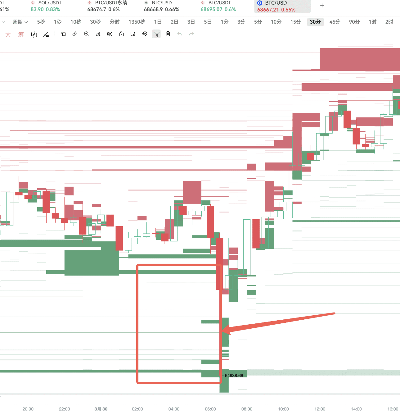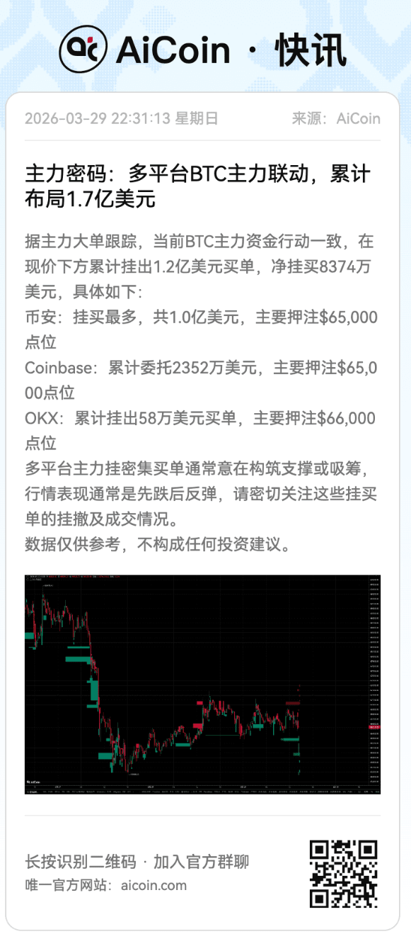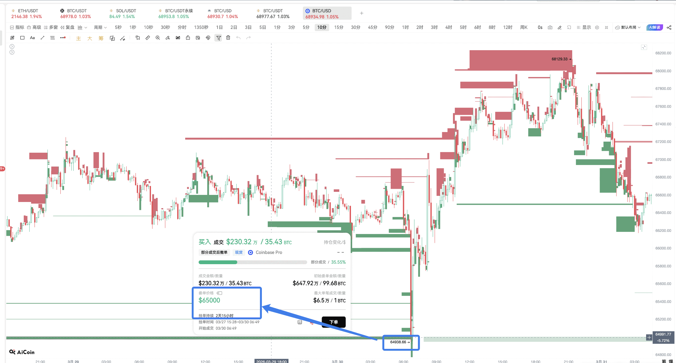 On March 29, Binance, OKX, and Coinbase simultaneously had large buy order walls, and Coinbase displayed an order wall at the 65000 position for a full two days.
