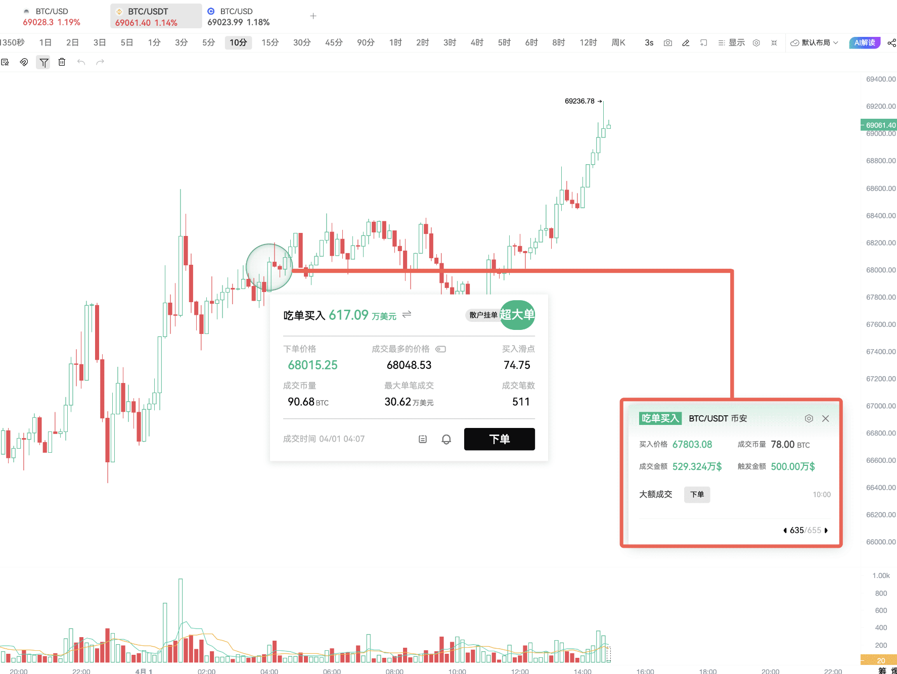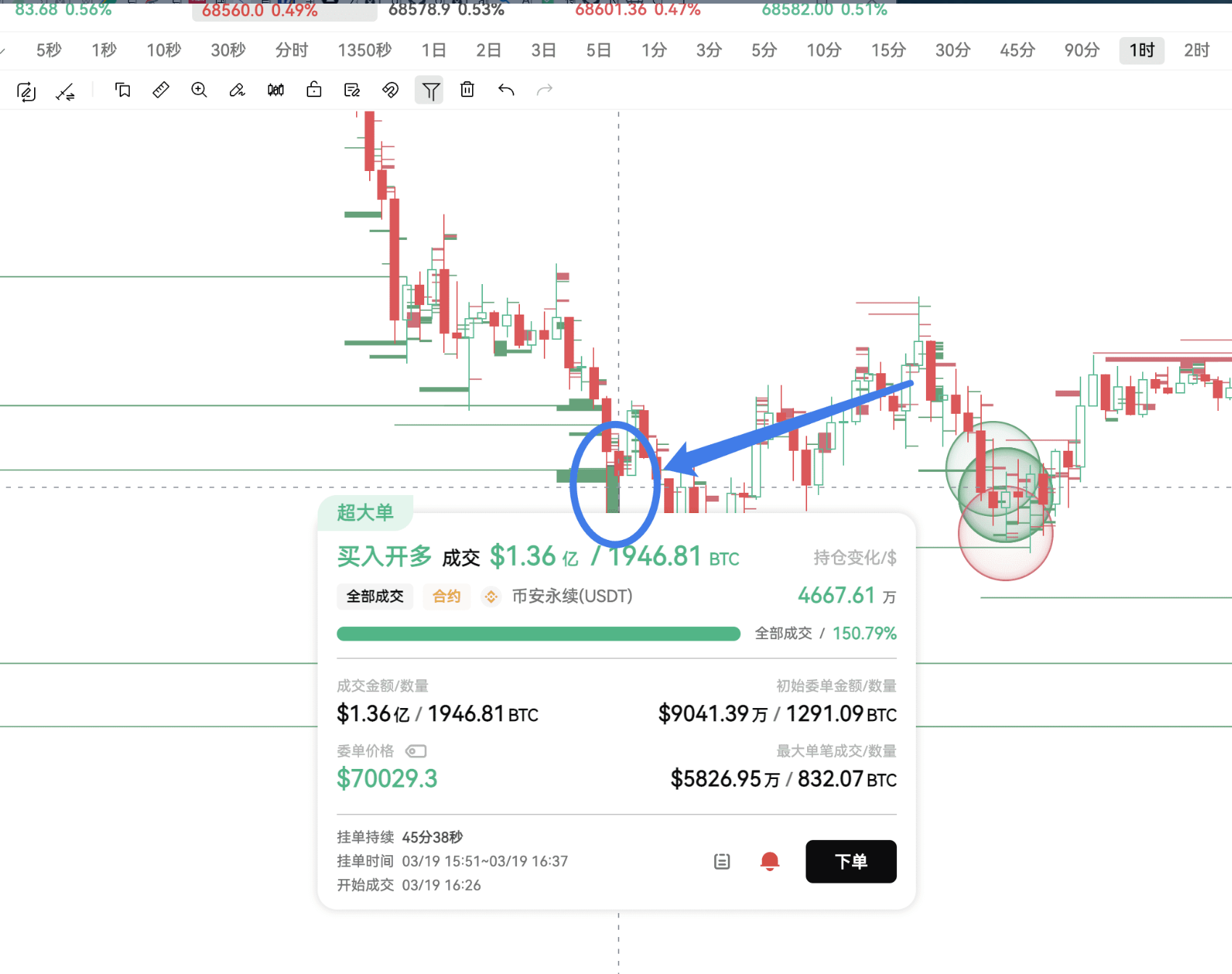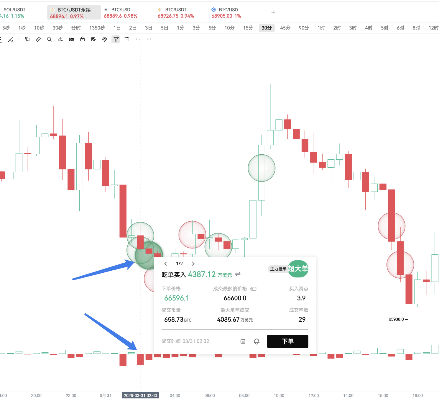 On March 29, Binance, OKX, and Coinbase simultaneously had large buy order walls, and Coinbase displayed an order wall at the 65000 position for a full two days.