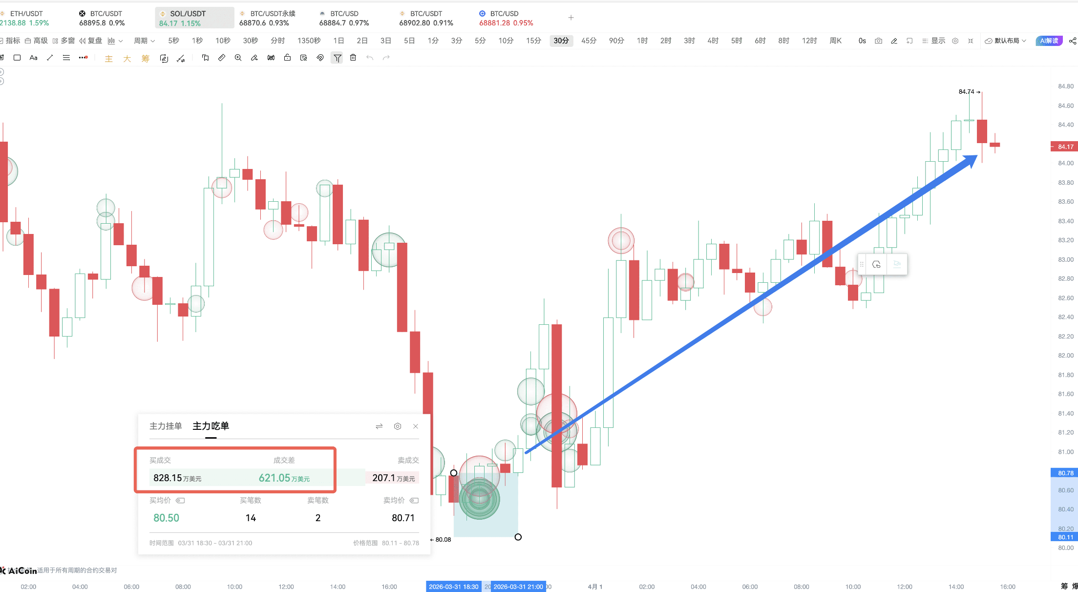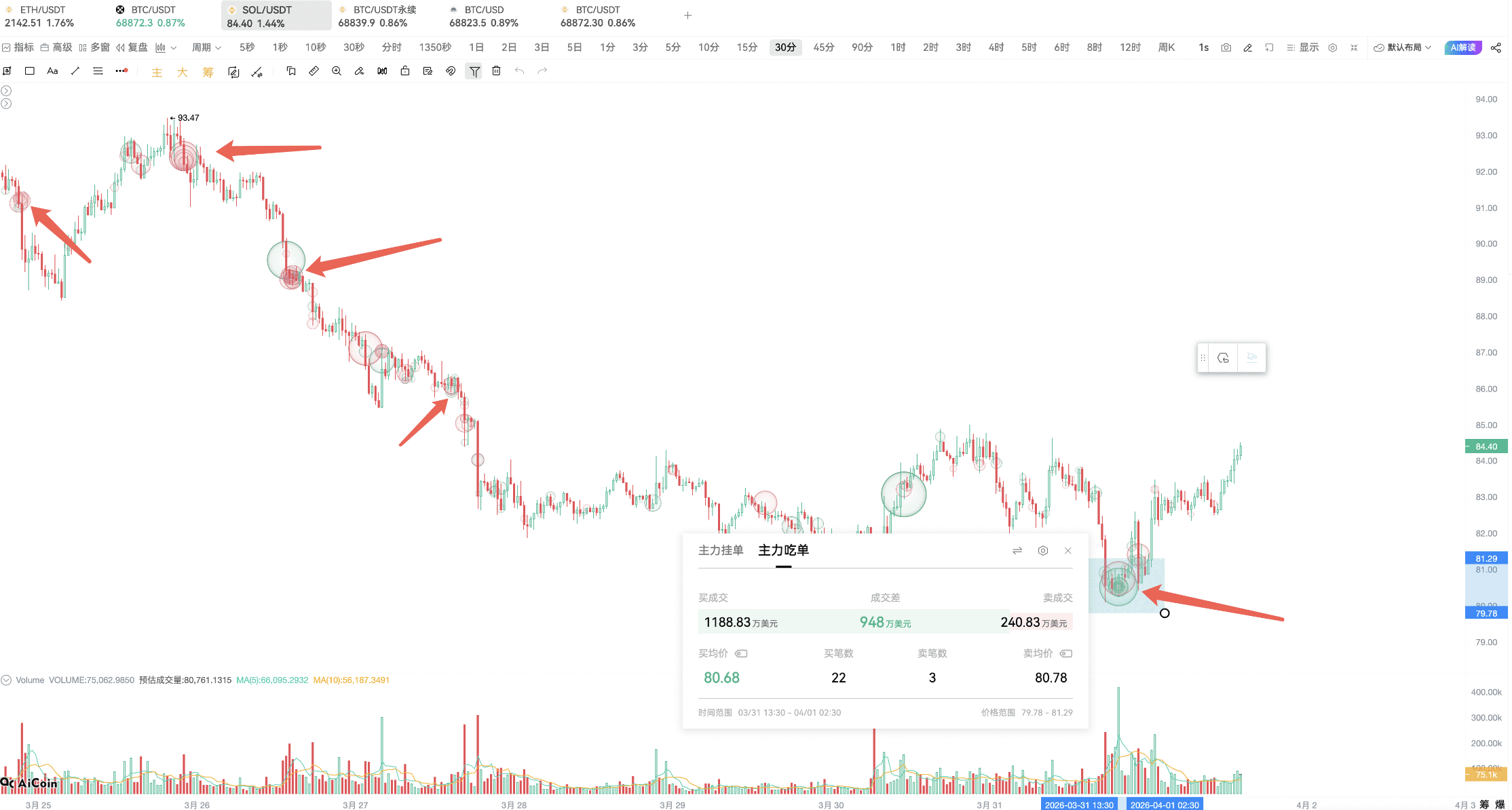 At 19:41, the main player executed 14 spot buy orders within 1 minute, totaling 8.28 million dollars, with an average price of 80.5.