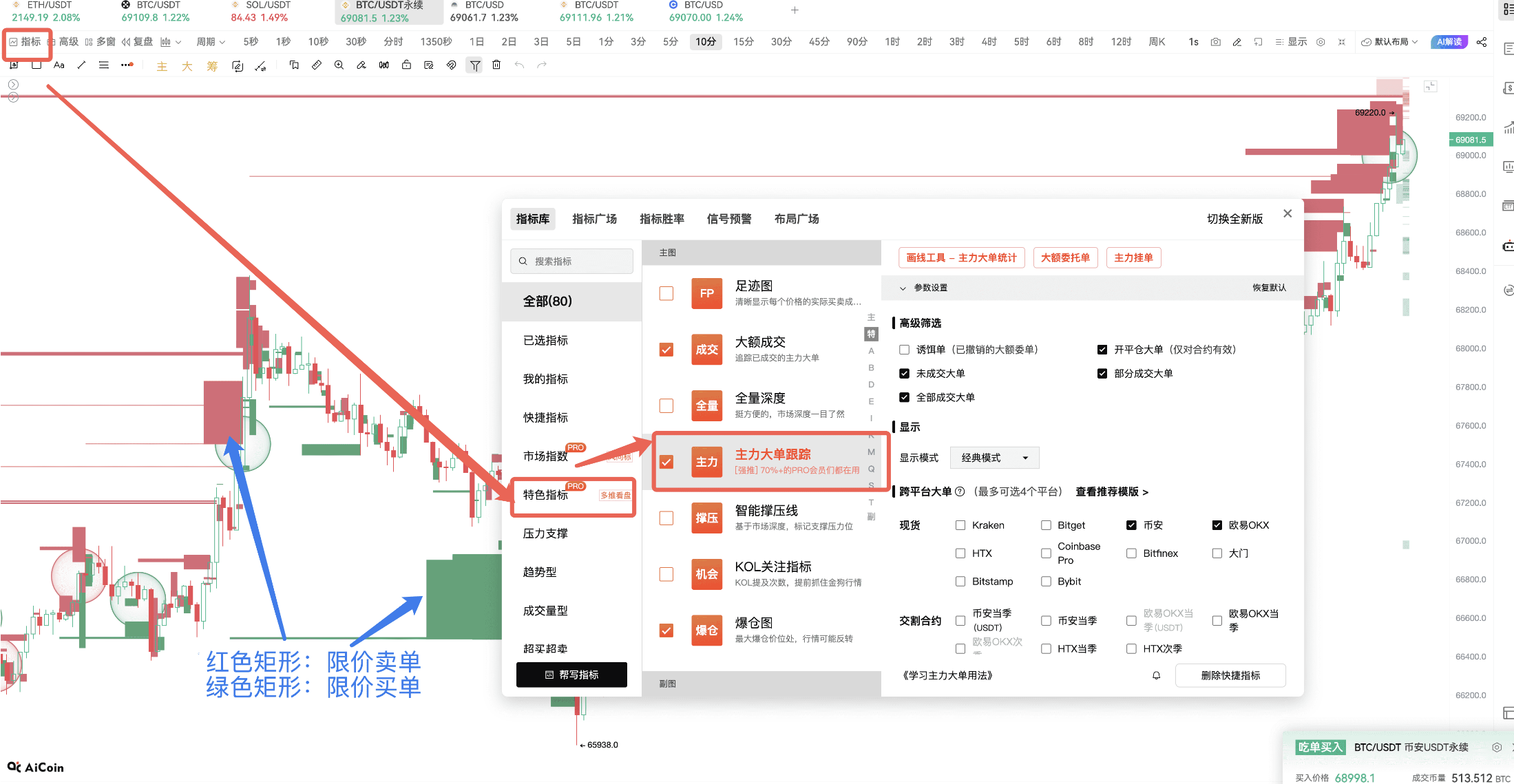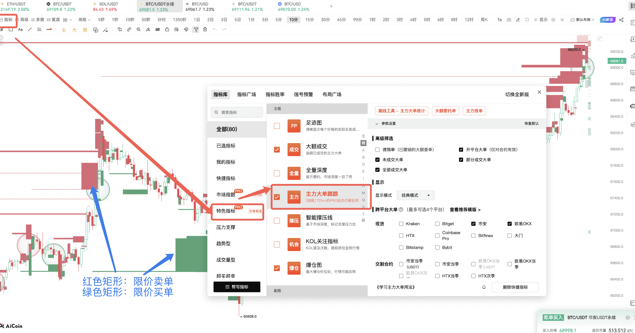 • Main Player Large Order Tracking: Monitoring large limit orders, cancellations, and actual transactions