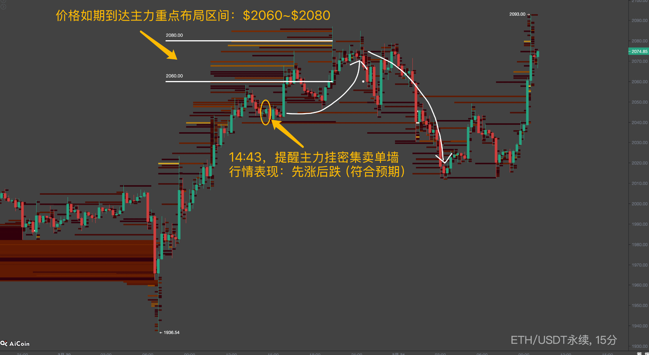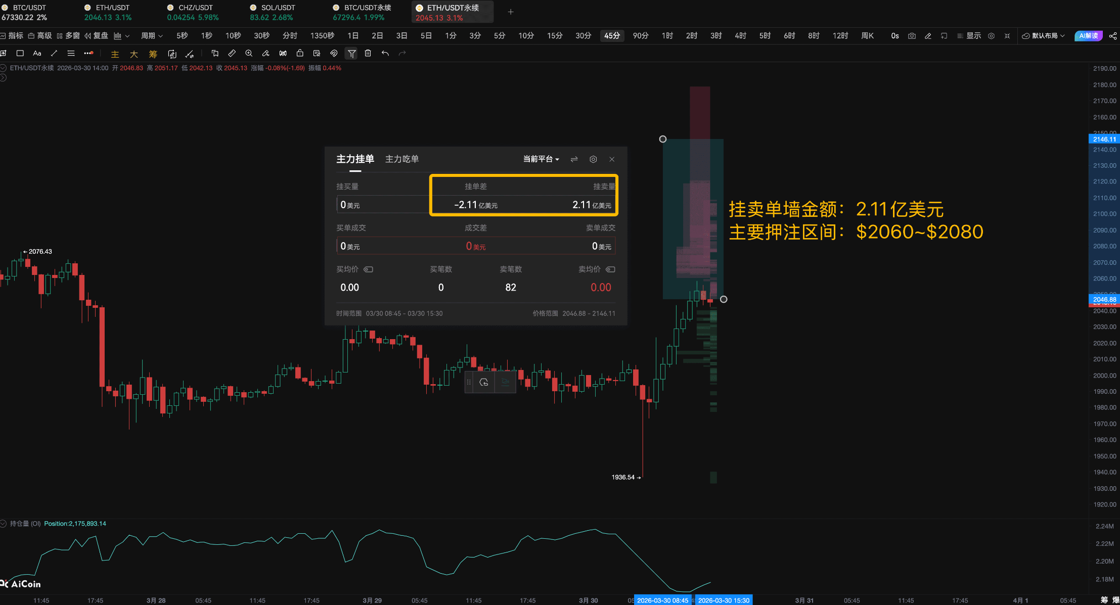 On March 30, the main player set up a dense sell order wall between 2060 and 2080.