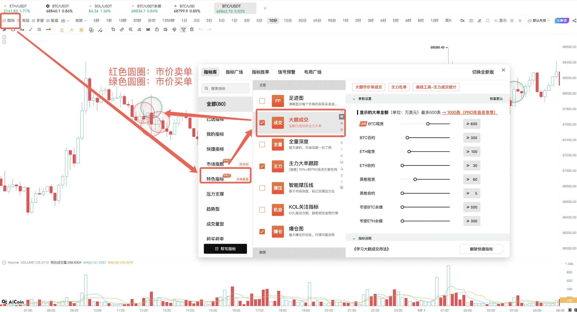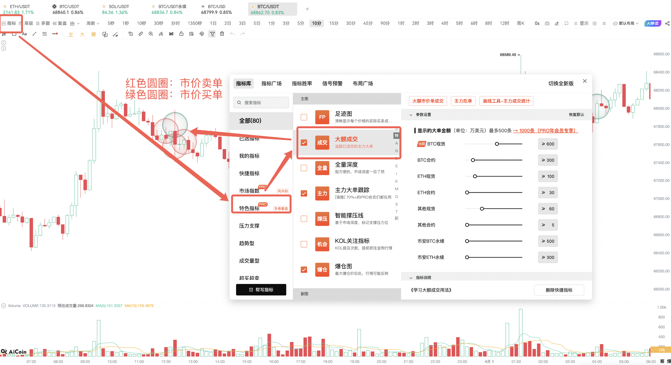 • Large Transactions: Tracking the main players' real market buy and sell orders