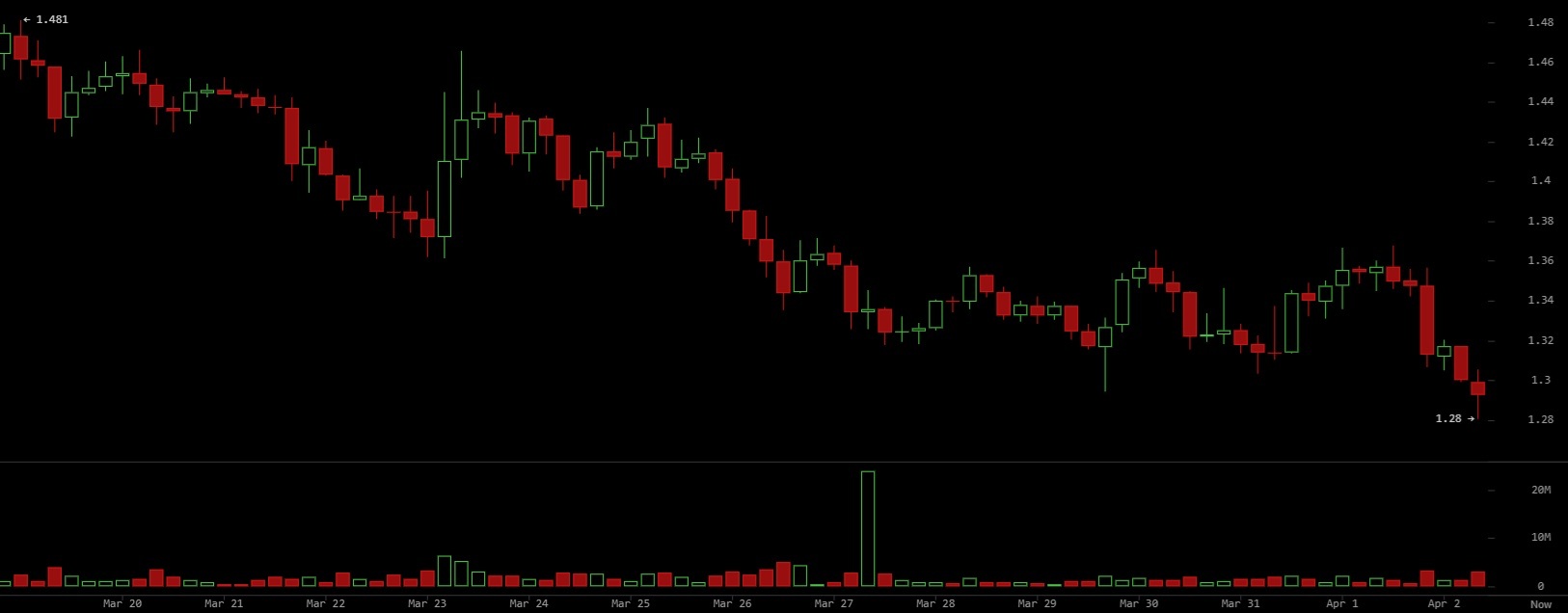 At 12:09 p.m. on April 2, XRP is trading at $1.29, extending its downward trajectory after failing to sustain a recovery above the $1.33–$1.34 region. The asset remains under pressure near the lower boundary of its recent range, with price action continuing to form lower highs and lower lows. Over the past 24 hours, XRP has declined 4.58%, reflecting persistent selling activity and limited bullish conviction as it hovers just above the $1.28 area.