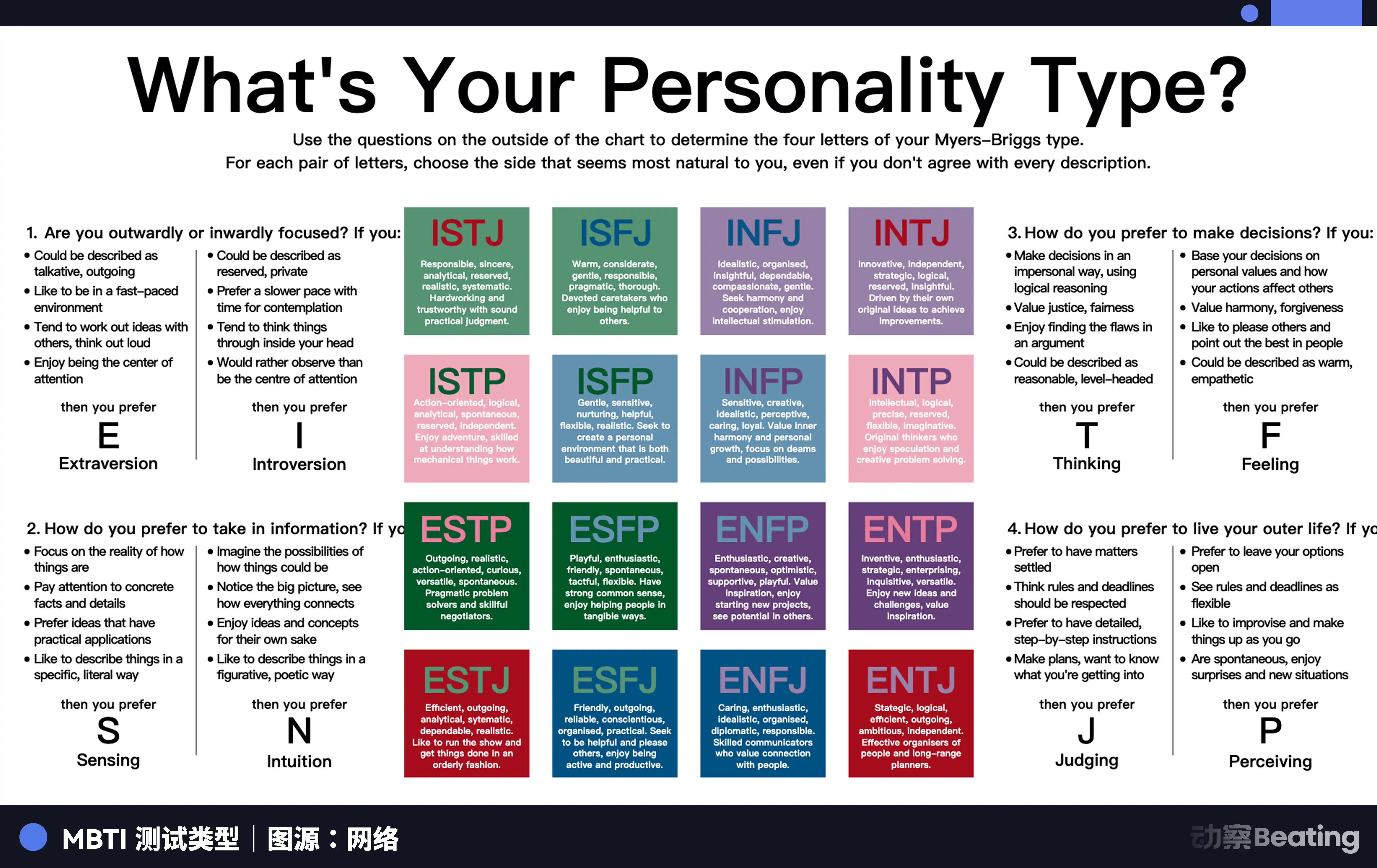 The logic of MBTI is to understand oneself and then find one's place. It rests on the assumption of a performance-oriented society, believing that one can find the most suitable "screw" position through quantifiable evaluation and maximize value in that role. Its popularity corresponds to young people's enthusiasm for self-optimization in that era, as they aimed to figure out what type they were to find the best solutions in the workplace, social interactions, and dating.