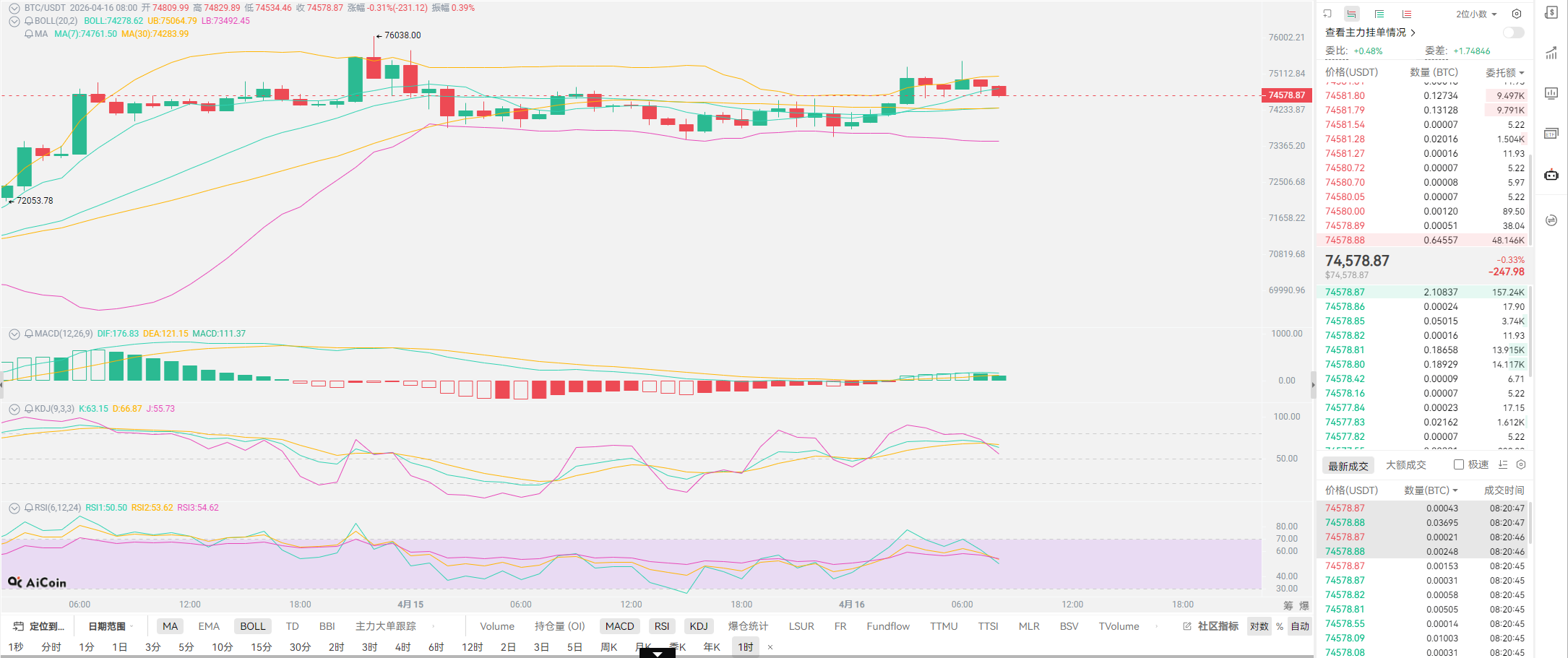 After waiting all night, I finally reached the profit-taking position. In the morning, Bitcoin touched a new daytime high of 75425, and is currently in a correction phase, with the current price at 74555. The new low yesterday also hit 73514, and the sell and buy pressure above and below are very obvious, with selling at 75000 and buying around 73500. The overall trading volume is basically guaranteed, and recent active data is quite good. After reviewing this data, Lao Cui believed that this stage should be a growth phase, but it is clear that problems have arisen during the growth segment. Let's discuss the contract position with an emphasis on short-term trends. The core remains spot trading; users who want to buy spot may not have many opportunities. Today, Iran made another statement, saying that subsequent crude oil products will no longer be exported. The core issue is that crude oil facilities have been destroyed, which suggests that subsequent crude oil prices will be dominated by the Americans. As long as the military situation does not expand, there is a high probability that the financial market will return to normal.