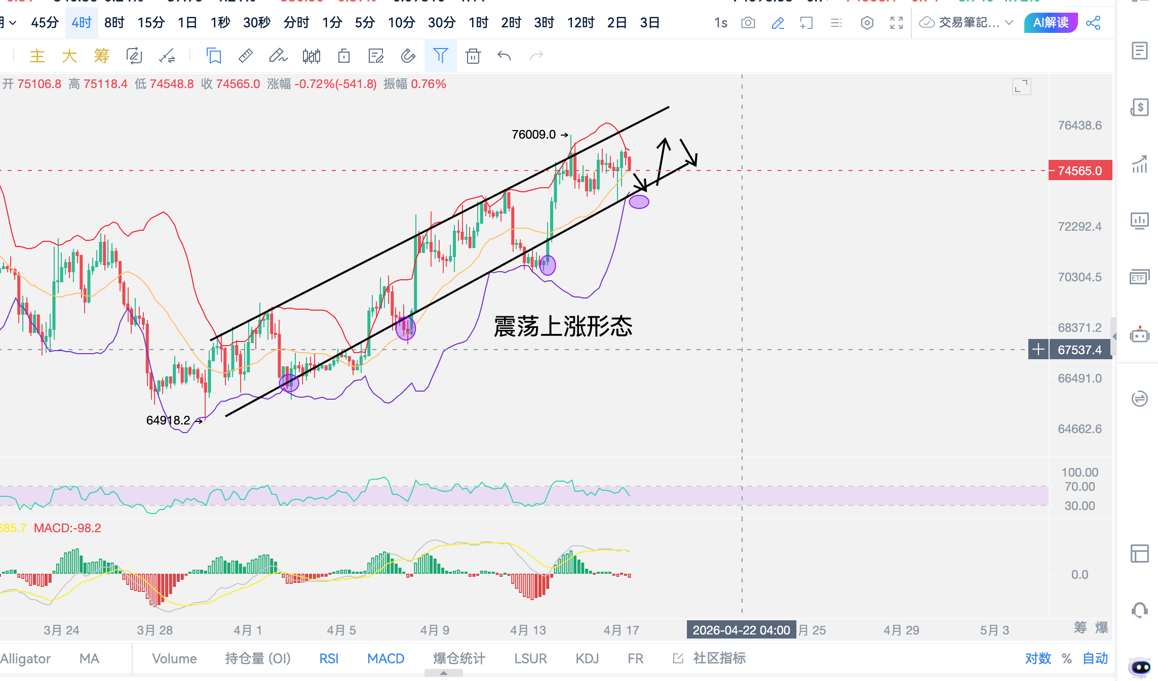 The current trend of Bitcoin is very clear, with the price basically fluctuating around the upper range of 75200-73300. For the current trend, it is best to maintain a high short and low long strategy.