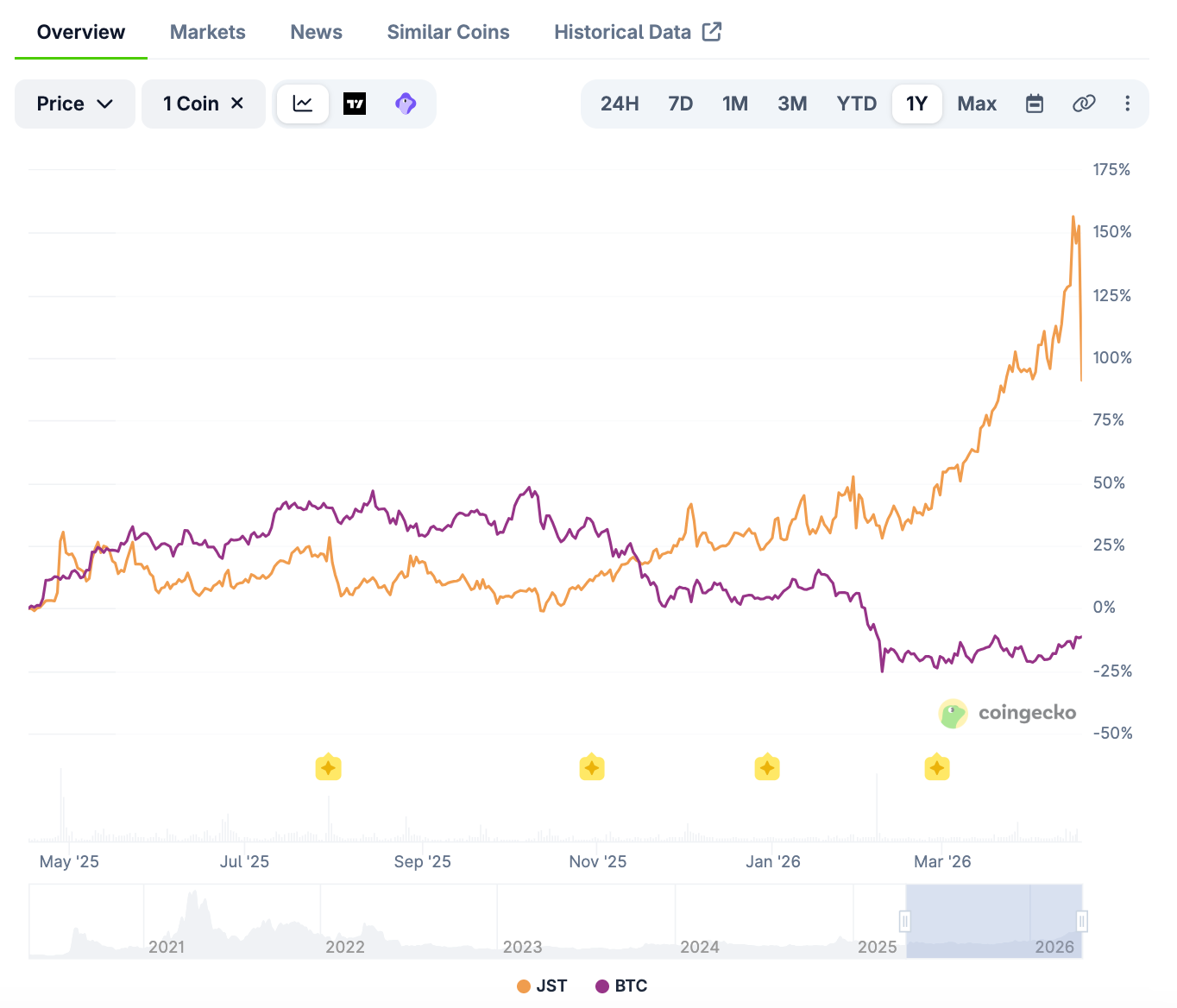 The market's real feedback perfectly corroborates this deflationary logic. As of April 16, CoinGecko data shows that, supported by robust protocol fundamentals, the total market capitalization of JST has exceeded 500 million dollars. Since the launch of the JST repurchase and destruction plan, the token price has shown counter-cyclical growth momentum, displaying a unique "Alpha attribute" during market volatility. JST has completely opened its space for long-term appreciation in the market through endogenous deflationary drive.