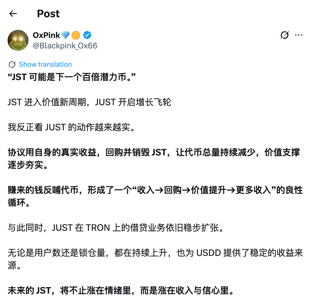 This mechanism design of “current support + future explosion” activates a self-reinforcing “positive flywheel.” Well-known KOL in the cryptocurrency industry @Blackpink_Ox66 stated on social media: "JST may be the next hundredfold potential coin." He keenly pointed out that JUST’s real revenue actions of repurchasing and destroying tokens are becoming increasingly tangible, and this virtuous cycle of “income nurturing tokens” is continuously solidifying its underlying value. As he summarized: “The future of JST will not only surge in sentiment but also rise with income and confidence.”