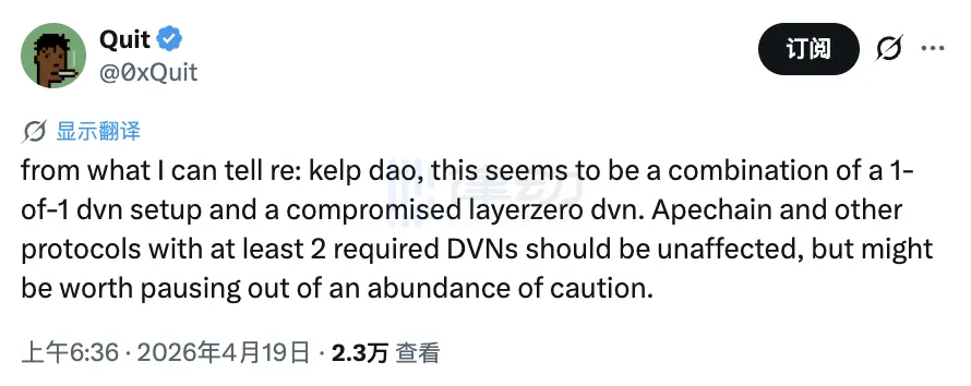 However, one thing distinguishes this attack from most hacker incidents. The smart contract code of Kelp DAO contains no vulnerabilities. Security researcher @0xQuit, who participated in the investigation, stated on X, "From what I know, this is a combination of two issues: the 1-of-1 DVN configuration and the DVN node itself being breached." LayerZero officials also did not mention the contract code in their statement, characterizing the issue as a "rsETH vulnerability" rather than a "LayerZero vulnerability."