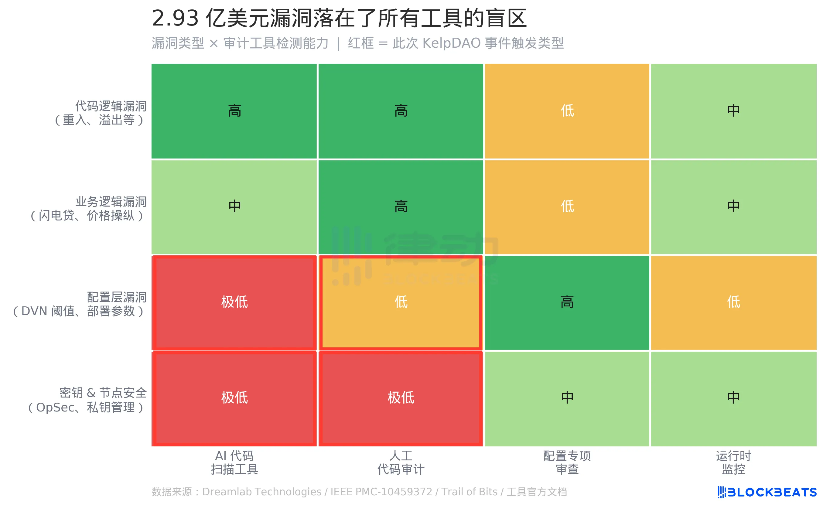 Also in the red area are key and node security. @0xQuit's description mentions that the DVN node was "breached," which falls within the category of operational security (OpSec), beyond the detection capabilities of any static analysis tool. No leading auditing firm or AI scanning tool can predict whether a node operator's private key will be leaked.