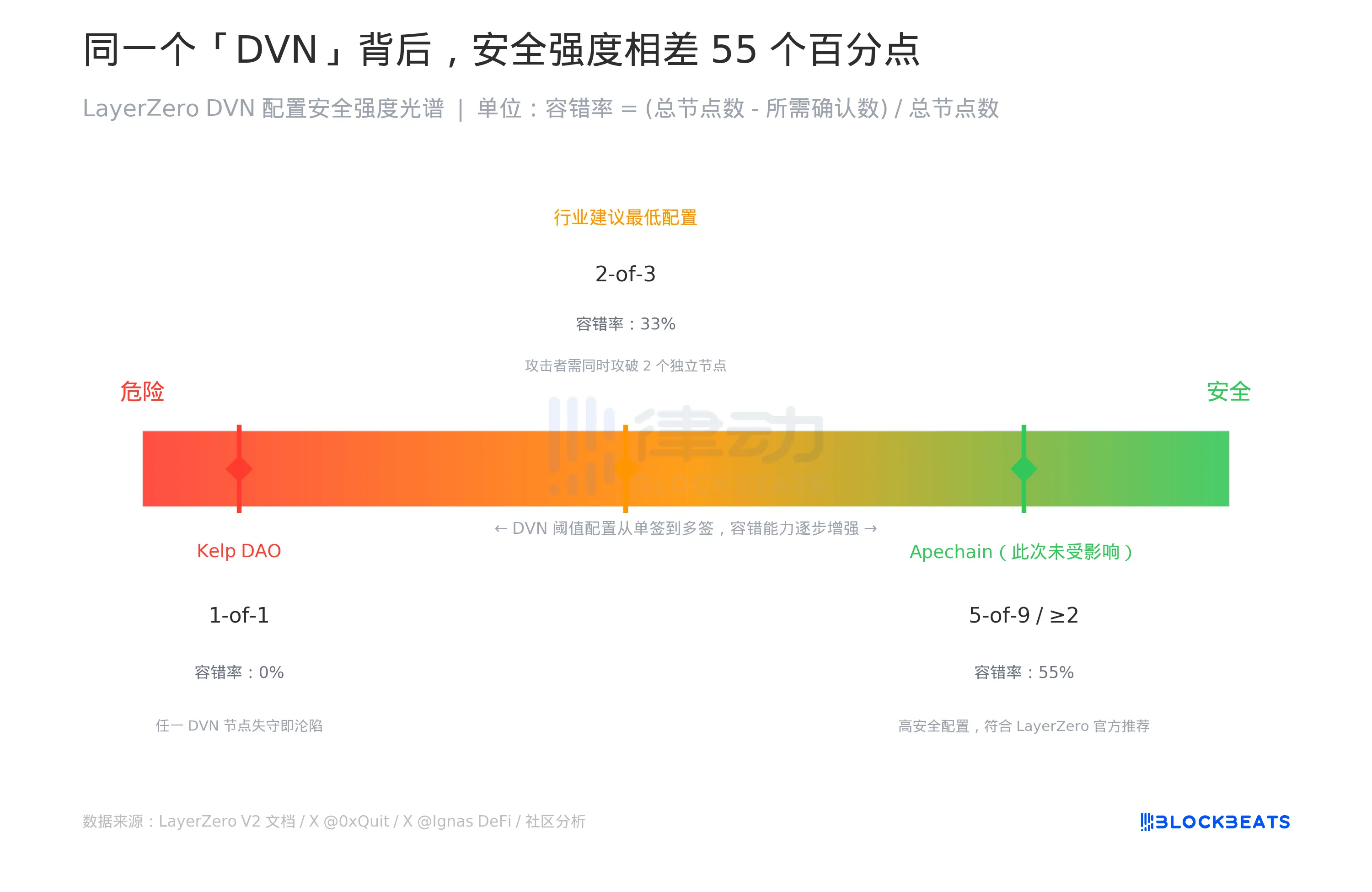 Kelp DAO chose the leftmost end of the spectrum, 1-of-1, requiring only one DVN node to confirm. This means there is zero fault tolerance; an attacker only needs to breach that one node to forge any cross-chain message. In contrast, Apechain, which also accesses LayerZero but is configured with more than two required DVNs, was not affected in this incident. LayerZero's official wording in the statement was "all other applications remain secure," implying that safety depends on the configuration choice made.
