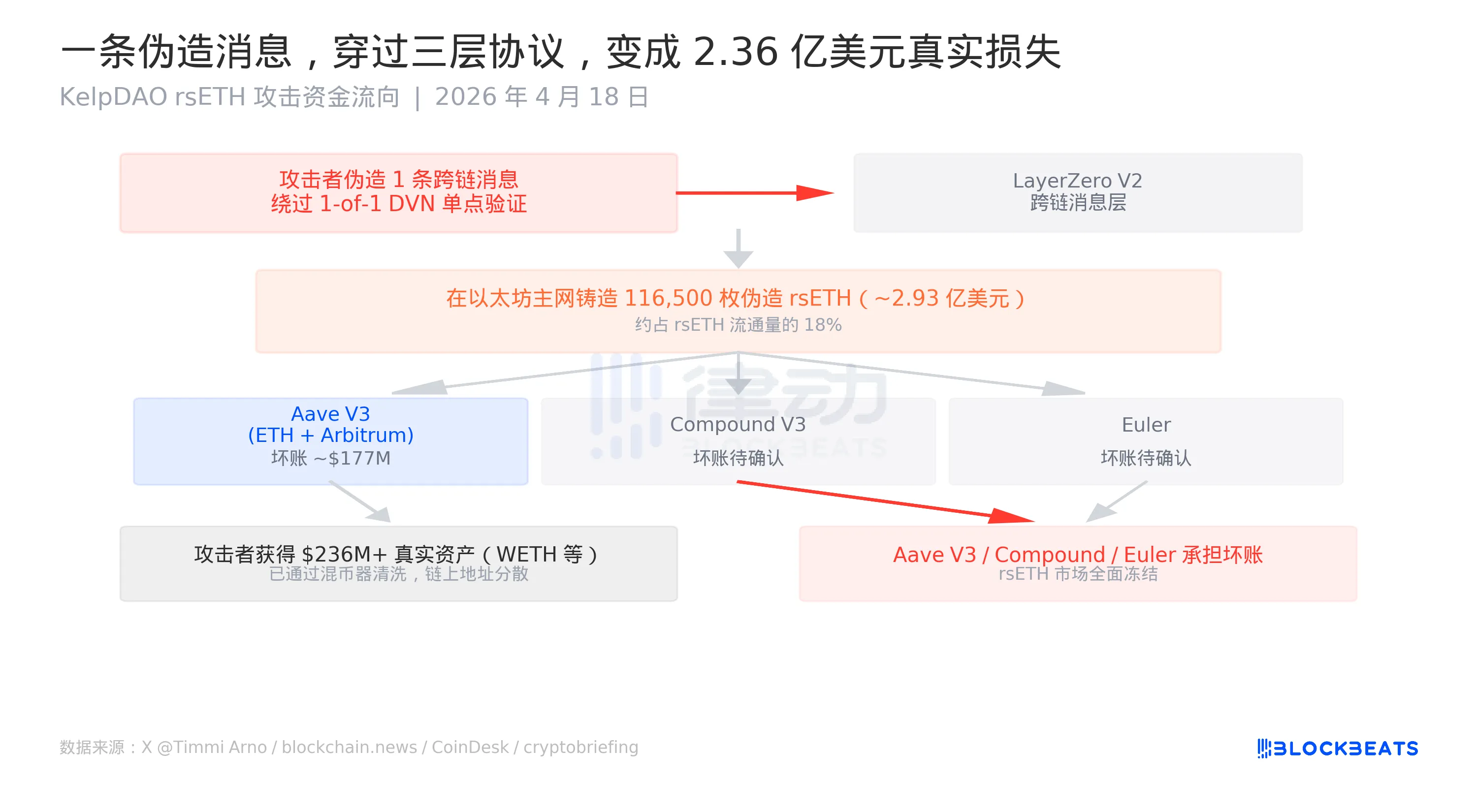 On April 18, 2026, the liquidity re-staking protocol of Kelp DAO was attacked within hours, with attackers withdrawing 116,500 rsETH from a cross-chain bridge, amounting to approximately 293 million dollars at the time. The whole process was unusually efficient, moving from forging cross-chain messages to borrowing real assets by distributing illicit funds across three lending protocols: Aave V3, Compound V3, and Euler. On the same day, the attacker exited with 236 million dollars' worth of WETH. Aave, SparkLend, and Fluid promptly froze the rsETH market.