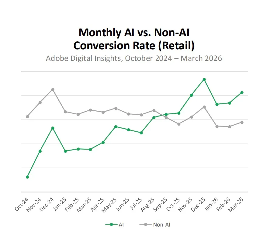 By March 2026, Adobe reports AI traffic was converting 42% better—a new record, according to the company, which tracks over one trillion visits to U.S. retail sites. Revenue per visit from AI referrals was 37% above non-AI traffic as of last month.