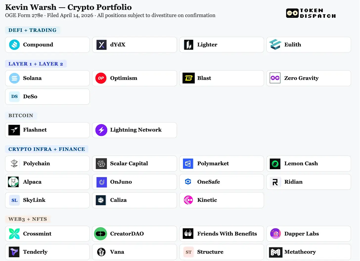 If Kevin Warsh wants to lead the Federal Reserve, he must sell his shares in Solana, dYdX, Optimism, Polymarket, Dapper Labs, and roughly twenty other companies. This is indeed a strange prerequisite for taking office, but it is legally mandated and applies to anyone seeking to regulate the U.S. financial system, regardless of their understanding of the system.