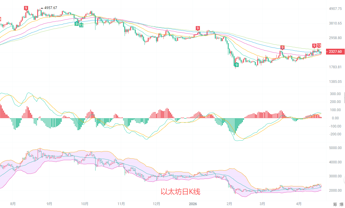 The daily KK line is stable above the EMA15, EMA30, and EMA60 moving averages. Short-term moving averages are arranged upwards, providing strong support. The MACD red bars continue to exist, and the DIF and DEA are still in the upward area, indicating that the rebound trend has not yet ended. The middle track of the Bollinger Bands around 2230 is a strong support level, with the price repeatedly testing it without breaking. The upper track at 2456 represents a strong resistance in the short term; if it cannot break through, it is highly likely to maintain sideways fluctuations.