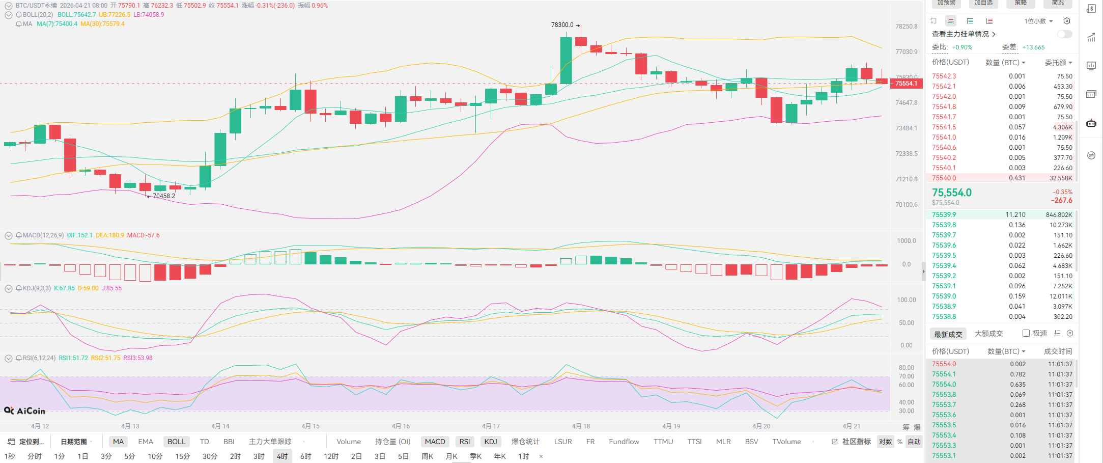 I conclude: In the short term, still viewing from a linear perspective, with yesterday's breakthrough, the market is currently operating above the middle track, forming a shape that could challenge previous highs. The Bollinger Bands are opening upwards, KDJ's three lines are running parallel, and the RSI’s three values are above 30 and below 60, showing no obvious signals of overselling or overbuying. This is a trend of choosing direction. Combining with the current news, there will soon be a second round of negotiations between Iran and the US, which aligns perfectly with the trend. This indicates that the signals from this negotiation will determine the bullish or bearish trend, and everyone needs a core observation point. My approach will always be to capture a space of 500-1000 points, so my short-term strategy will still revolve around the earlier entry points, attempting long positions around 75000. Although there might be opportunities to enter at the current price, the risks are higher than before, so remember not to exaggerate gains. The bearish trend on the four-hour line is extremely obvious, and it is likely to be an upward trend after a dip and repair. Whether April can surge to the 80,000 mark will depend on how long this group of bullish users can hold on to the current trend.
