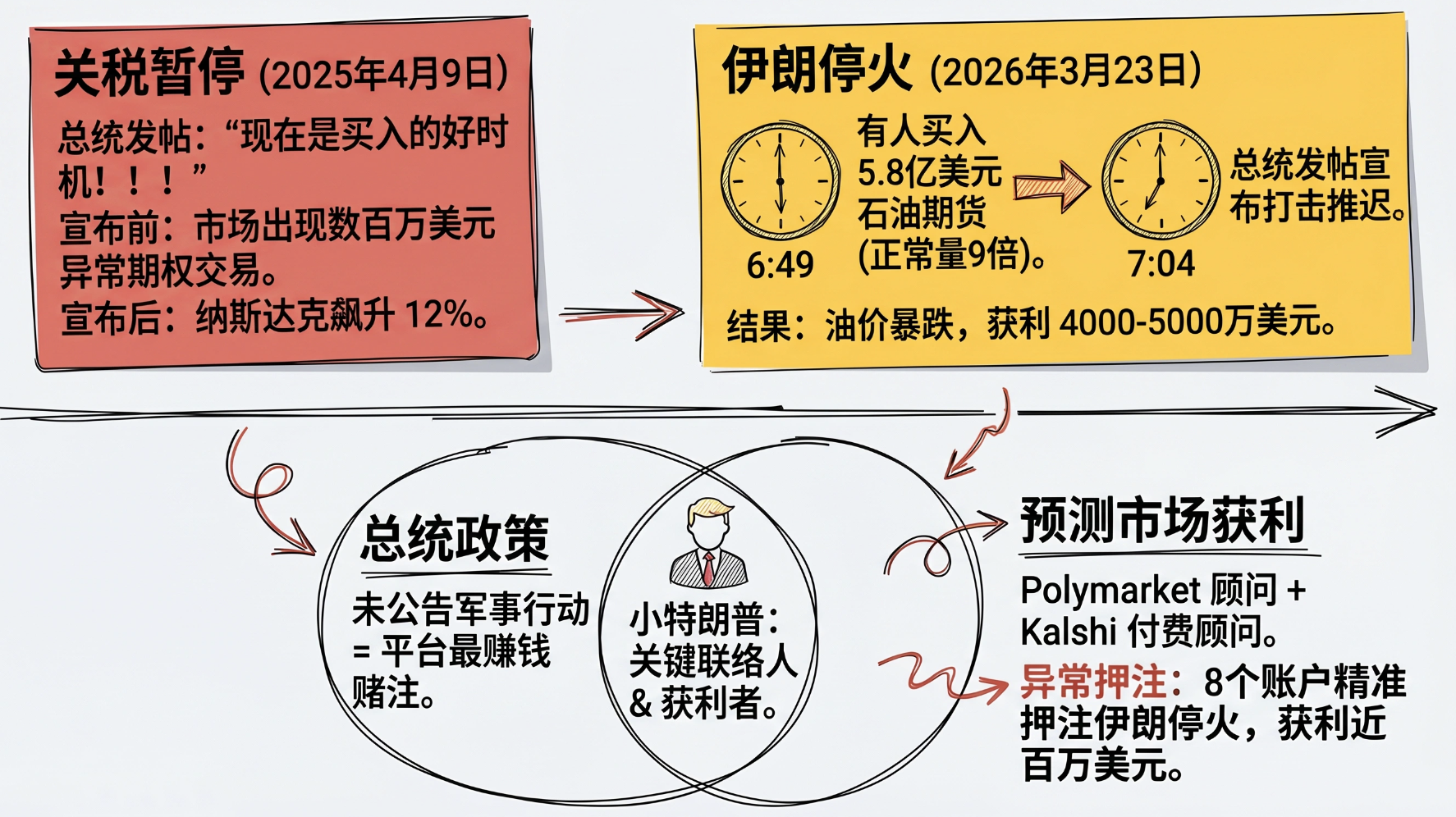 Iran Event (March 23, 2026): After the president stated he would attack Iranian power stations, oil prices rose. The following morning at 6:49 AM, just 15 minutes before the president announced "negotiation progress is going well, strike postponed," there was a market buy order for $580 million in oil futures (about 6,200 contracts, nine times the daily average). Oil prices subsequently fell, and the Dow Jones index rose approximately 1,000 points in a single day, with estimated profits for the involved positions ranging from $40 to $50 million.