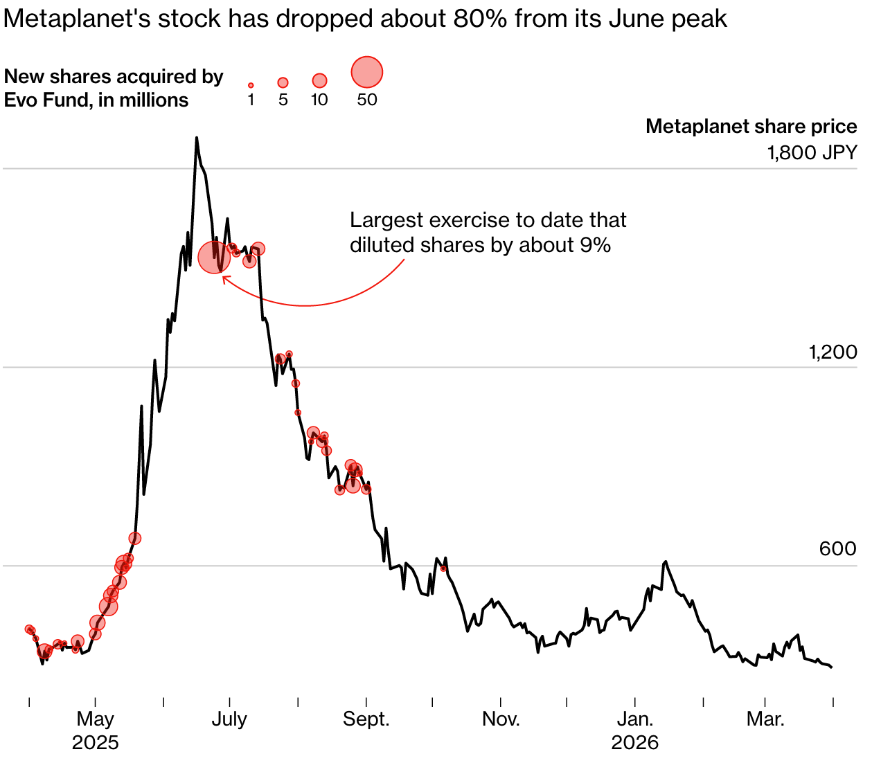 Metaplanet's stock price has dropped about 80% from the peak in June