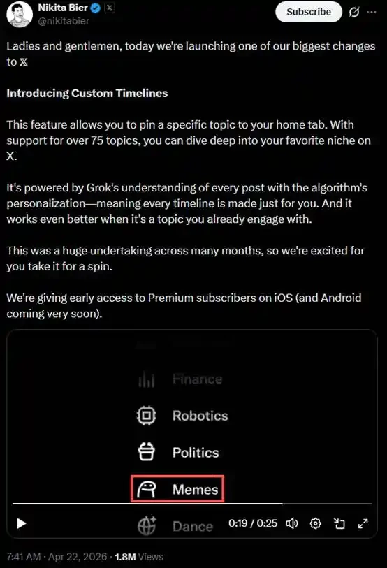 On April 22, Nikita Bier, the head of X products and Solana advisor, released the new feature "custom timeline" for X this morning. This feature allows users to pin specific topics on their homepage tab and supports over 75 interest topics, helping users delve deeper into niche content areas. In its promotional video, the meme topic section uses a Flork image as its logo.