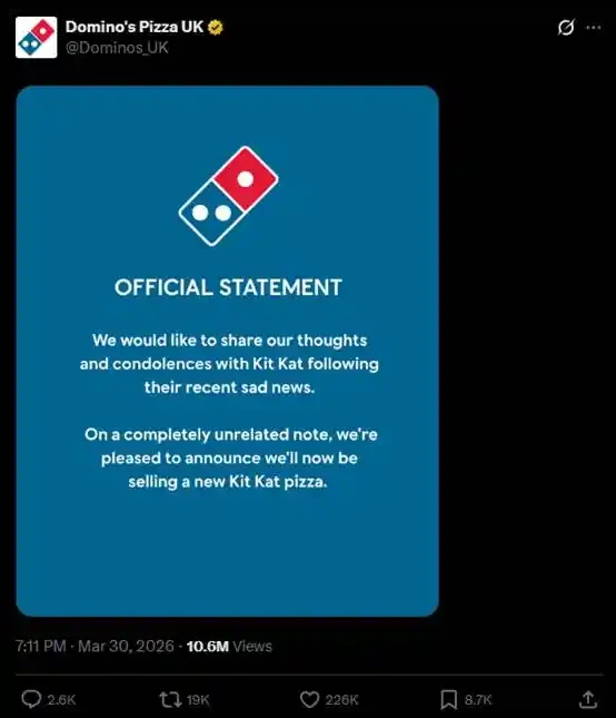 Other brands also participated in the "KitKat Heist" with cross-brand interactions in meme format. For example, Domino's UK X account jokingly announced that they would start selling KitKat pizza, with the tweet receiving 226,000 likes and 19,000 retweets.