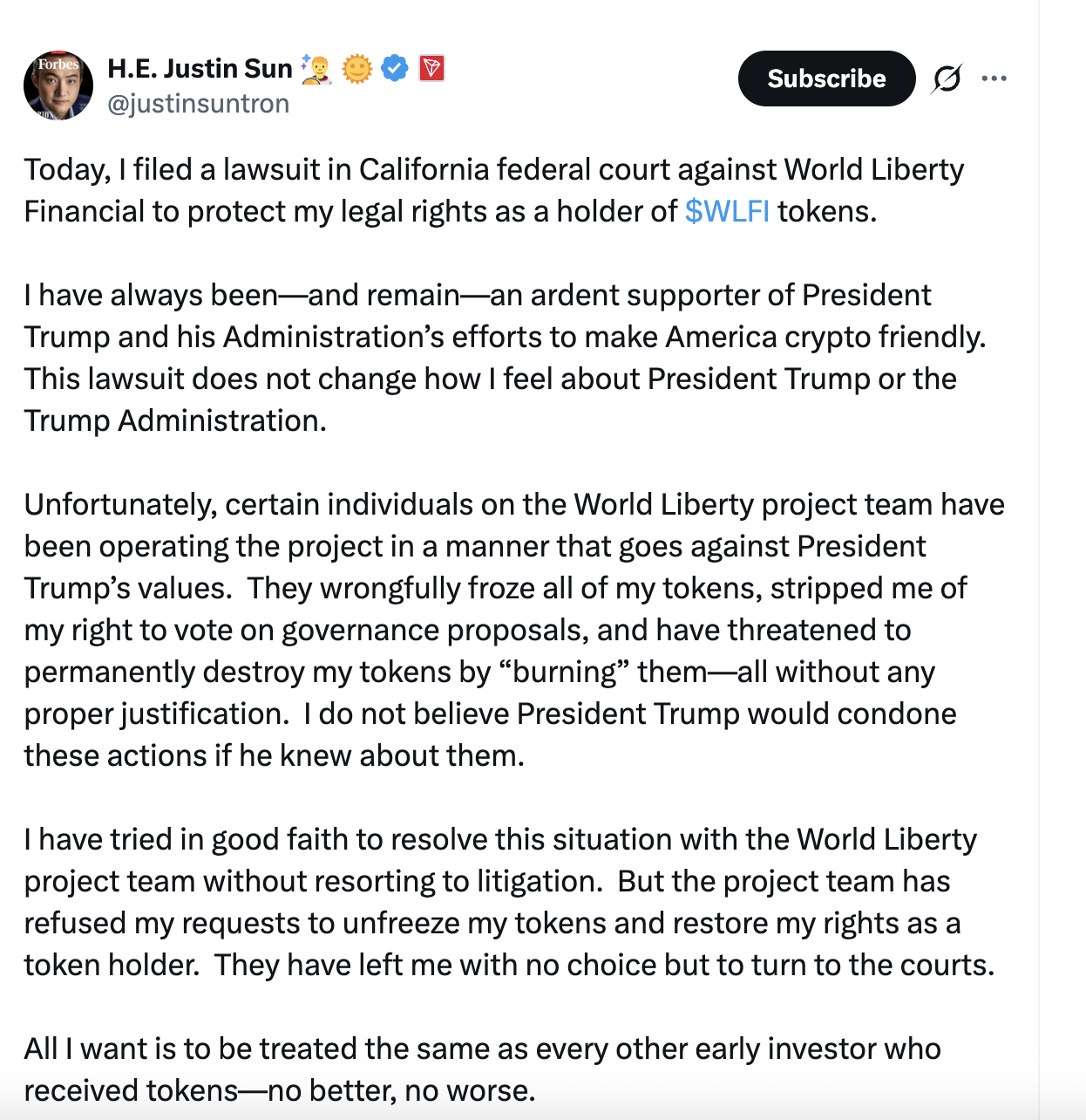 Sun Yuchen's original words on X were: "Unfortunately, some people in the World Liberty Financial project team operate the project in a manner contrary to the values of President Trump."