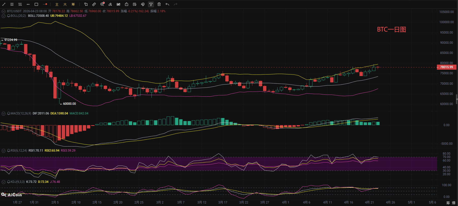 From observing the short-term hourly chart, the 4-hour Bollinger Band has narrowed, with prices running between the upper and middle bands, and upward momentum has significantly weakened. The MACD indicator's DIF has crossed below the DEA, with volume continuously turning negative; although the current price has not fallen below the short-term moving average, the KDJ indicator has formed a death cross at high levels and is diverging downwards, and the RSI indicator has retreated from the overbought area to a neutral zone, indicating that short-term bullish momentum is diminishing, and the price faces adjustment pressure. The current trend is likely entering a pullback confirmation phase, with particular attention needed on the overlap at the middle Bollinger Band and EMA20 moving average for support; if this support holds, an upward trend at the daily level is expected to continue after the adjustment; if support is broken, further downward movement may seek support, so it is advised to manage risks accordingly!