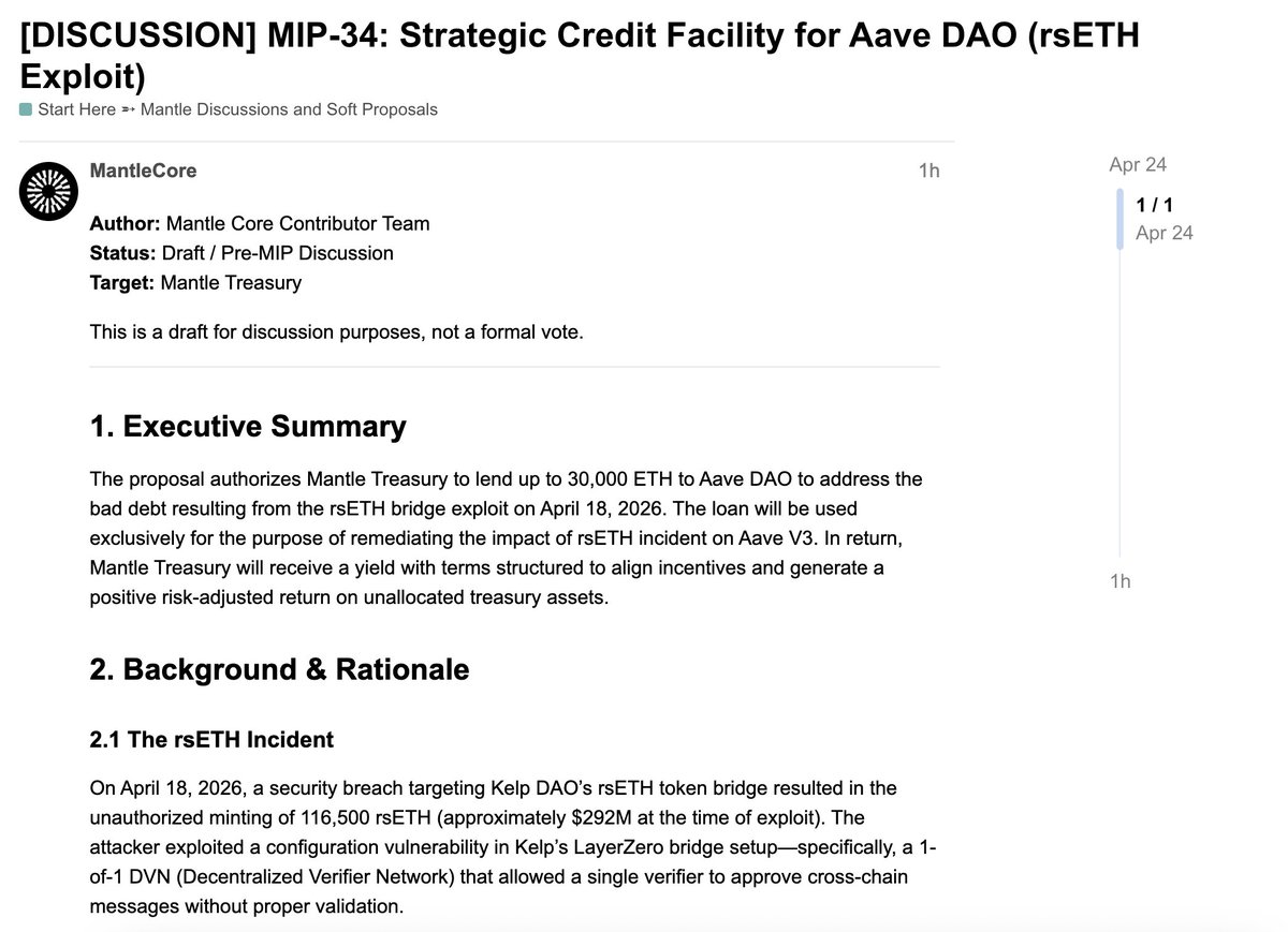 Mantle (@Mantle_Official) has proposed providing 30,000 $ETH ($70M) to Aave as a loan.