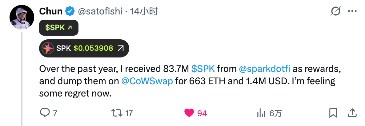 Even the founder of Fishpond, Wang Chun, expressed on X: "In the past year, I received 83.7 million SPK rewards from Spark and sold them on CoWSwap, getting 663 ETH and 1.4 million dollars. Now I feel a bit regretful."