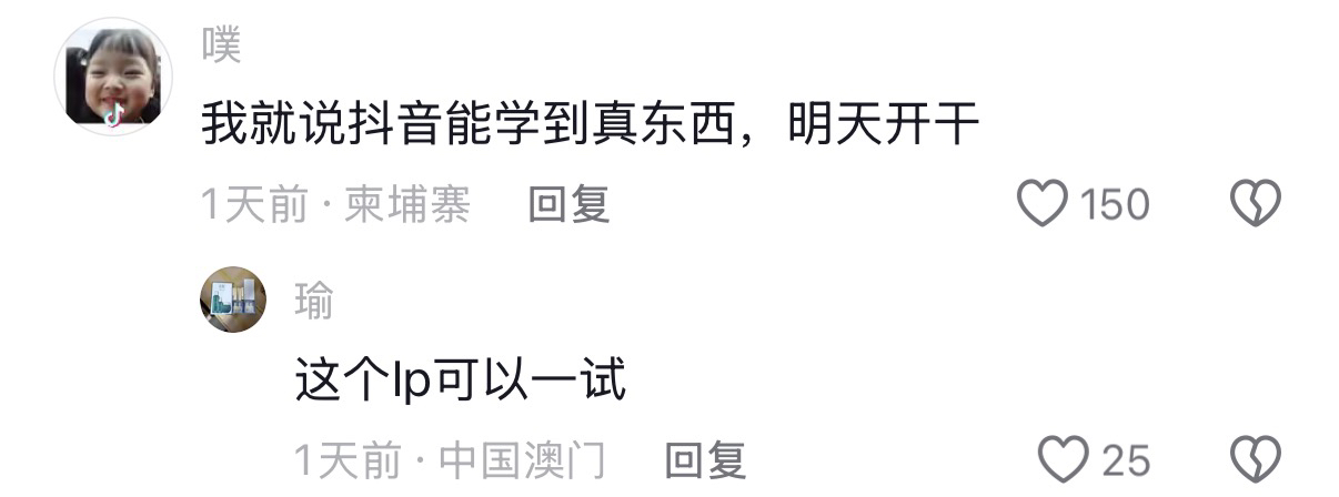 Another netizen with an IP in Cambodia said, I knew I could learn something real on Douyin, I'm starting tomorrow!