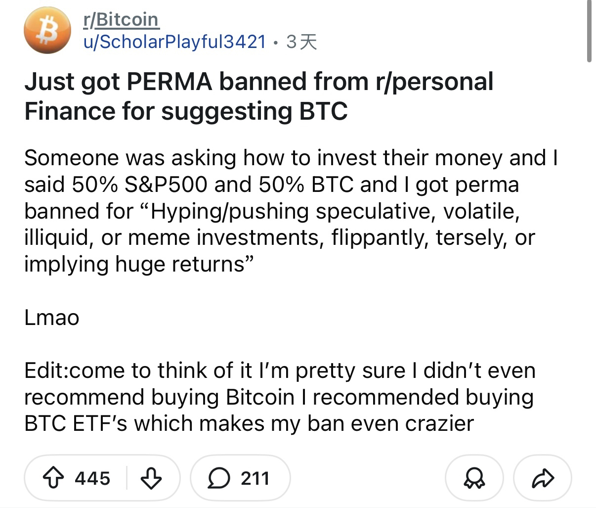 Reddit finance section: Recommend BTC? Permanently banned!
