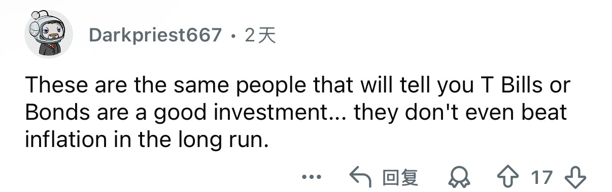 Netizens commented: This same group will tell you that buying short-term treasury bills or bonds is a good investment... yet these things can't even keep up with inflation in the long run 🤔.