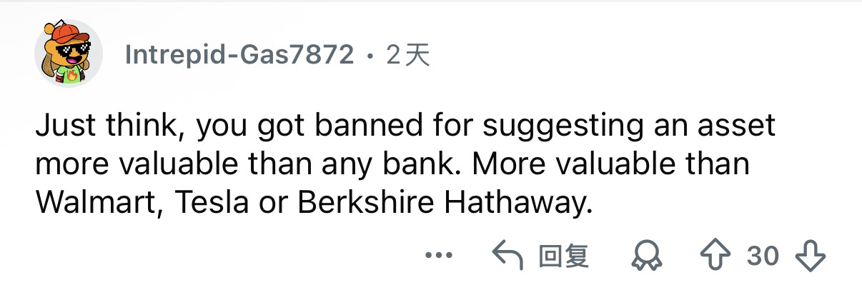 Netizens' spicy commentary: Just think, you were muted simply for recommending an asset with more value than any bank, worth more than Walmart, Tesla, or Berkshire Hathaway.