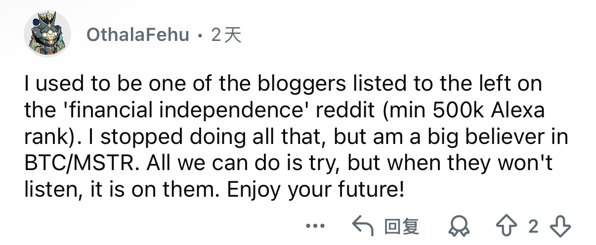 Another netizen said: I was once one of the bloggers listed in the sidebar of the "Financial Independence" section (a blog ranked below the top 500,000 on Alexa). I stopped doing that long ago and am now a staunch believer in BTC/MSTR. All we can do is try, but when they can't listen, they will have to bear the consequences themselves. Enjoy your future!