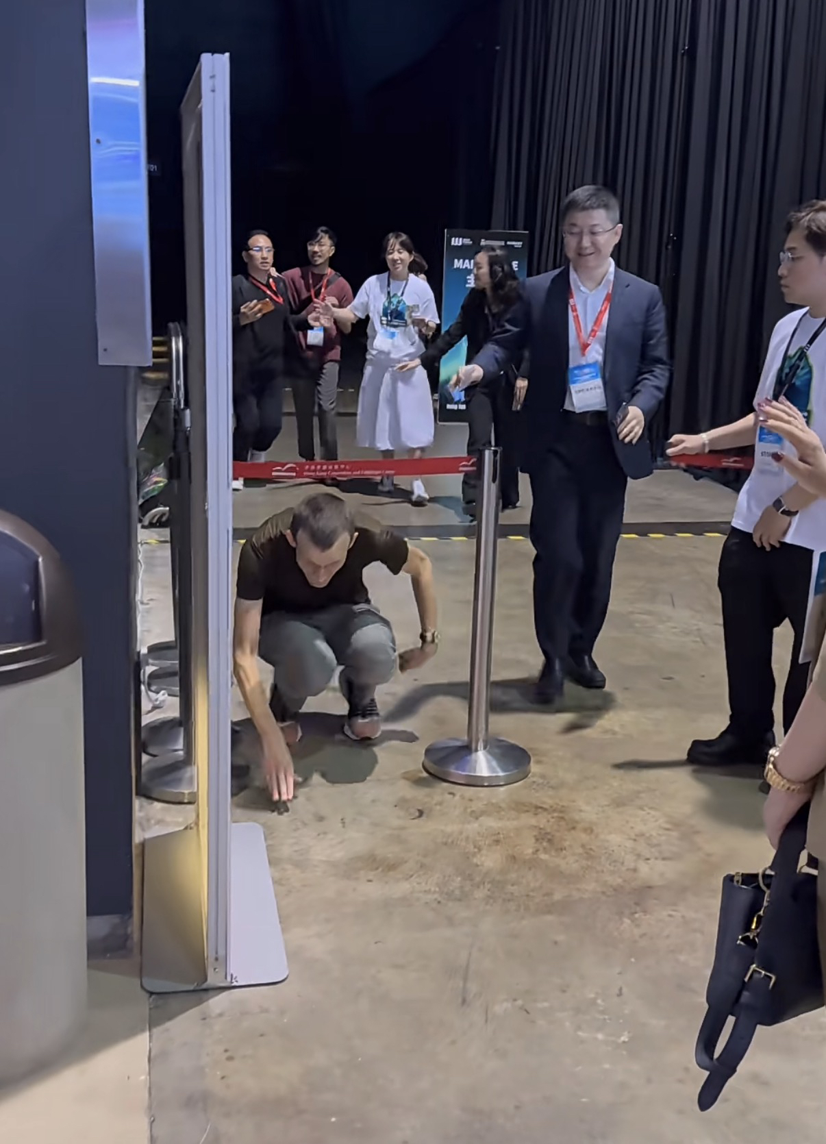 But Vitalik did not. He first made a posture as if to jump, then bent down and crawled right under the barrier!