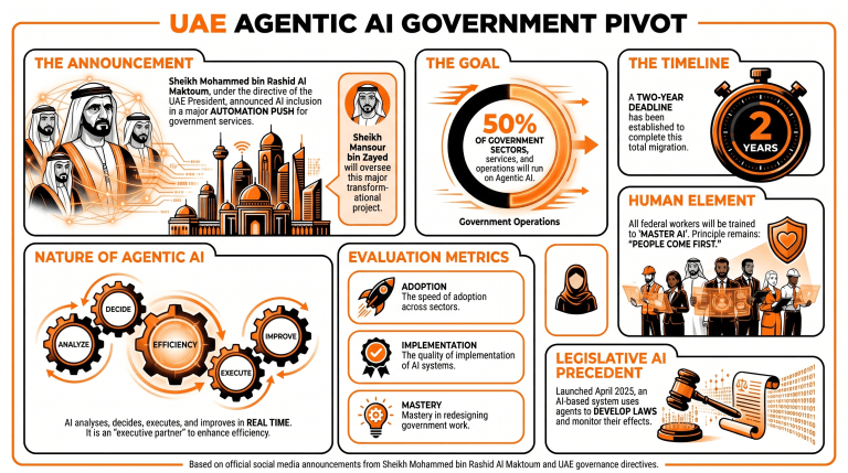 - UAE PM Al Maktoum announced a major pivot to run 50% of government operations on Agentic AI.