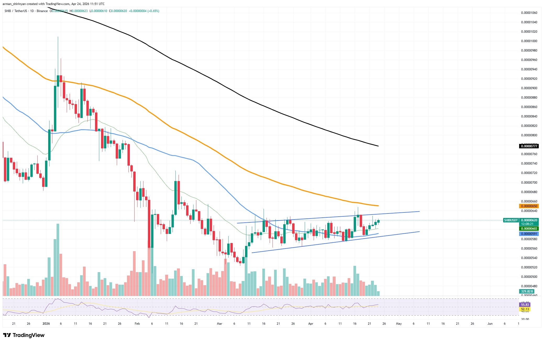 Following a protracted downward trend, SHIB is creating a modest ascending channel on the price chart. Although the higher timeframe moving averages, especially the 100 and 200 EMA, are declining, this is still a positive development. This restricts upside momentum unless there is substantial volume supporting a breakout.