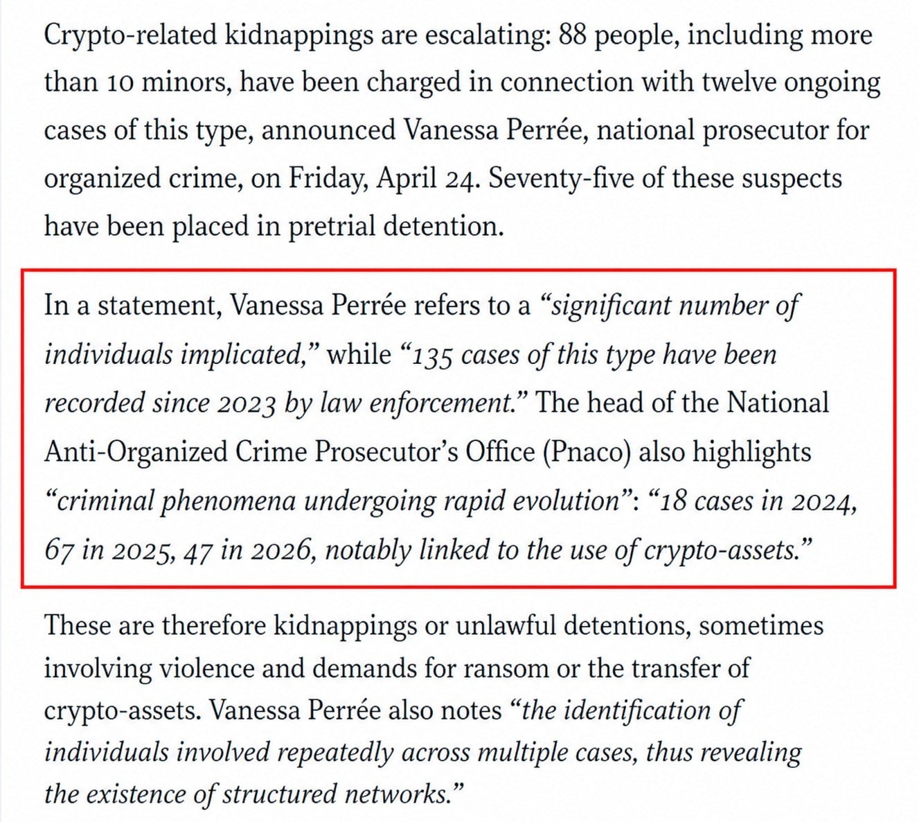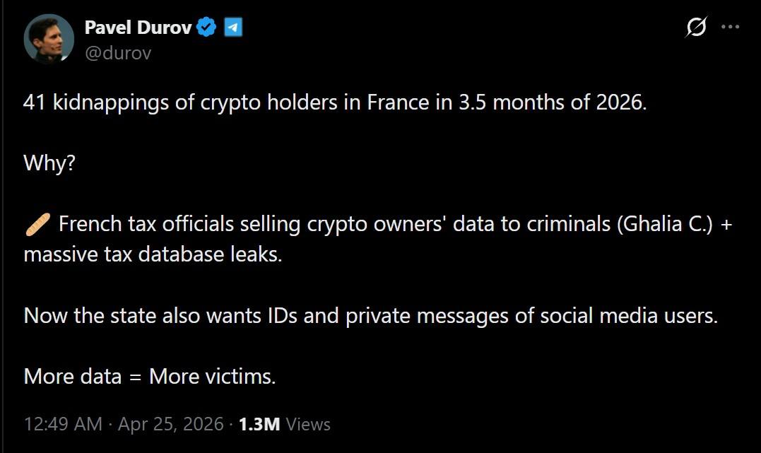 - More than 135 crypto kidnapping incidents have been recorded in France since 2023, with 41 attacks logged in 2026 at a rate of one every 2.5 days.
