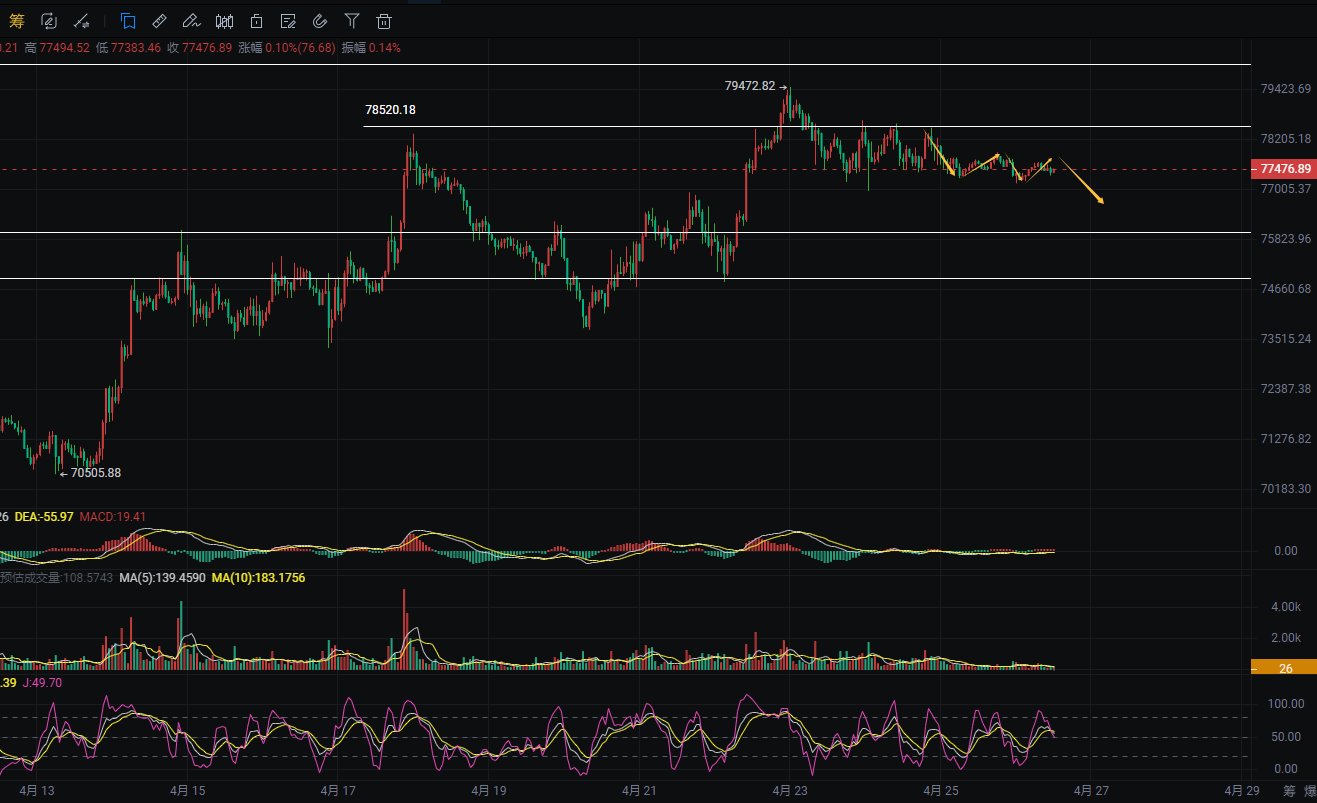 The main cryptocurrency has retreated after a rise, and is currently hovering around 77,400 with weakness. The overall bull trend on the daily chart is still intact, and the medium- and long-term moving averages are still firmly supporting the market. The overall bullish pattern has not changed yet. However, after a series of significant rises, the upward momentum has obviously weakened, and indicators are gradually retreating to digest overbought conditions, mainly focusing on a high-level fluctuation and pullback in the short term. Pay attention to the support at 76,000 below and heavy resistance at 78,500–79,400 above. The 4-hour chart has shown a weakening trend, forming a death cross structure at high levels, with bearish momentum continuously being released. Short-term moving averages have turned down to suppress the market, and the rebound strength is limited, overall in a phase of correction and recovery. The 1-hour chart shows repeated grinding in a small range, and rebound pressure is evident, with the bullish and bearish battle leaning towards weakness. 77,000 is a key watershed for short-term bulls and bears. If the range is maintained, a breakdown would further test the support around 76,000. Overall, the major trend remains bullish, but the short-term correction is not over yet, and caution against blindly chasing highs at elevated levels is advised. Patience is needed to wait for a pullback to key support before making low buys. As long as 75,000 as a lifeline is maintained, the bullish structure will not be damaged, and this mindset should be kept in the short term.