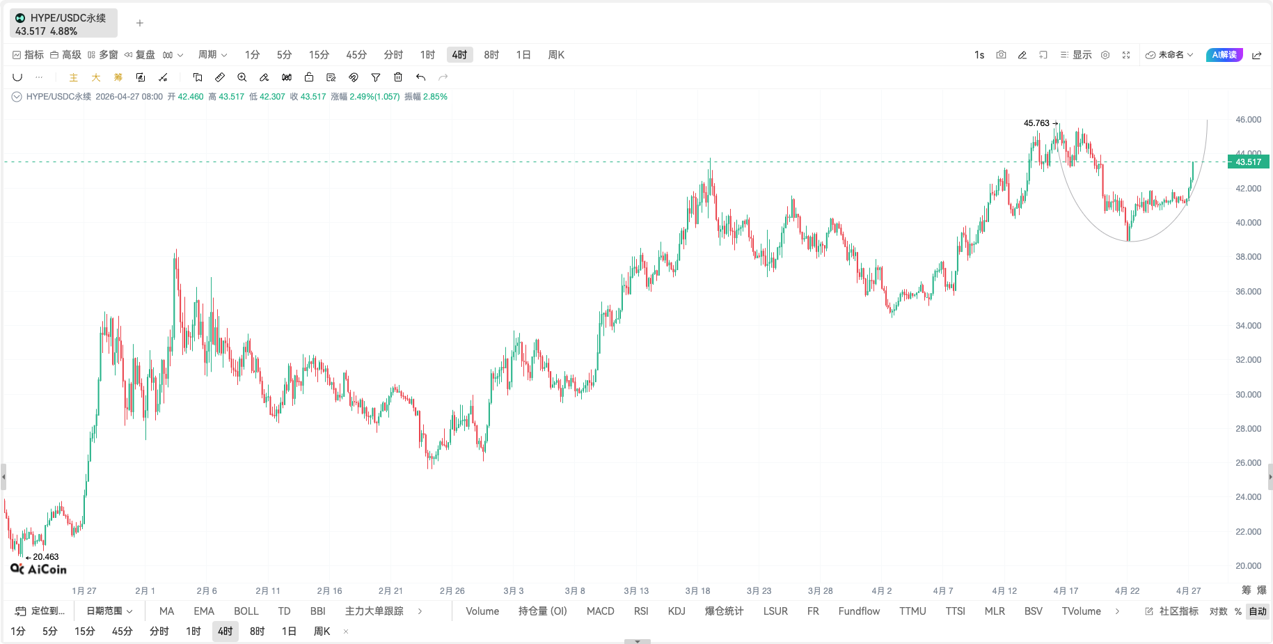 1. Deep "Cup Body" Consolidation: After touching 45.763 around April 12, the "left rim" of the cup (previous high), HYPE underwent a deep correction, testing bottom around 28 in late March to early April, with a retracement of about 39%. This "U-shaped" bottom formation, taking about 6 weeks, fully cleared out the prior profits, resulting in a sufficient chip exchange.