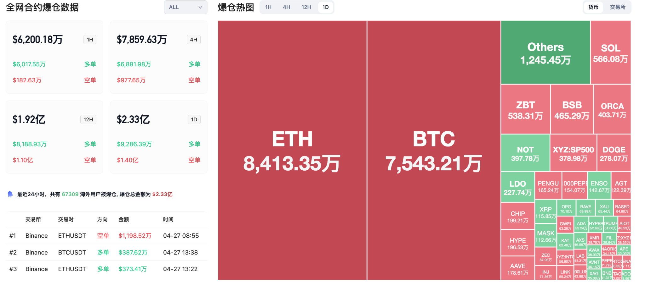 24-hour liquidation data: A total of 67,309 people were liquidated worldwide, with a total liquidation amount of $233 million, including $84.13 million for BTC, $75.43 million for ETH, and $5.38 million for ZBT.