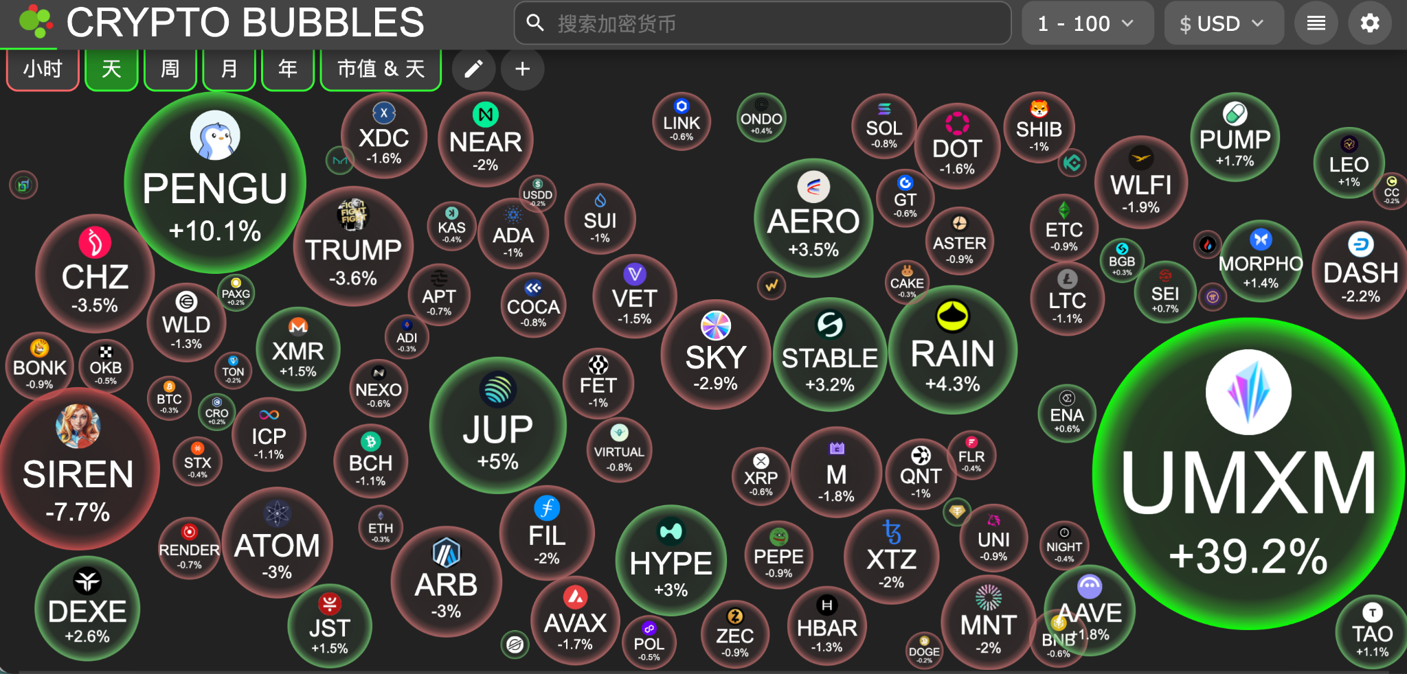 Today, the top gainers among the top 100 coins by market cap: Manadia up 39.2%, Pudgy Penguins up 10.1%, Jupiter up 5%, Rain up 4.3%, Aerodrome Finance up 3.5%.
