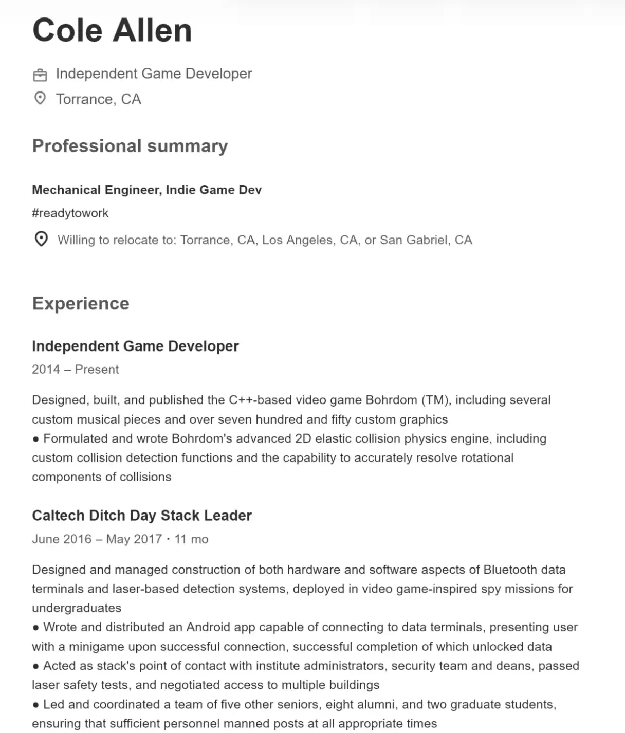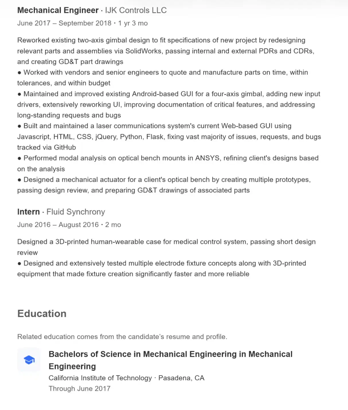 In his job, he worked as a mechanical engineer at IJK Controls in Southern California, primarily engaged in the design of precise mechanical systems (such as gimbal structures), optical platform analysis, and was also involved in software development, including Android interface optimization and web-based development based on laser communication systems. Furthermore, he independently developed games for a long time, completing everything from low-level physics engines to graphics and soundtracks by himself. Overall, his background spans engineering and software, with a comprehensive technical ability.