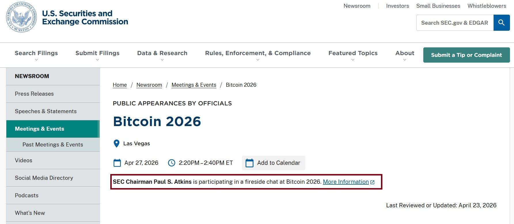 • SEC Chair Paul Atkins is set to address the attendees of Bitcoin 2026 in Las Vegas on April 27.