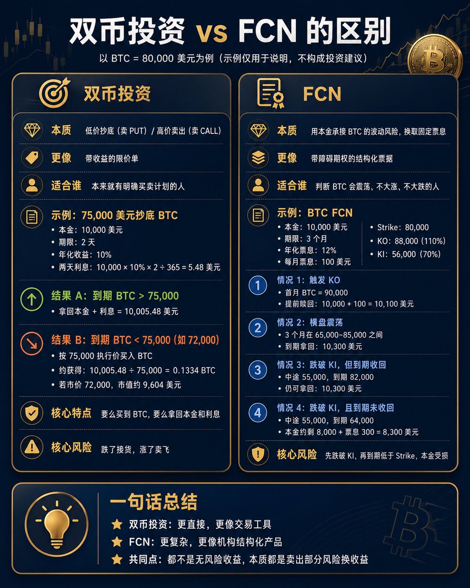 For example, if the current price of Bitcoin is $80,000, I will illustrate the differences between dual-currency and FCN.