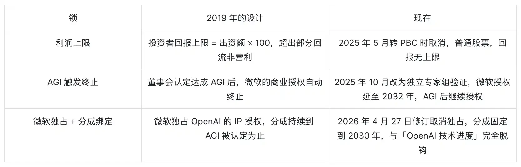 The dismantling of the AGI trigger clause is the most subtle. Originally, "Achieving AGI means terminating the commercial license with Microsoft," signifying that AGI belongs to the public, and OpenAI would not privatize it. After revision, AGI is to be assessed by an "independent expert group," with Microsoft's license extended to 2032, explicitly covering models after AGI, and Microsoft is permitted to independently pursue AGI. This is a version where even the key defining "who is AGI" has been replaced.