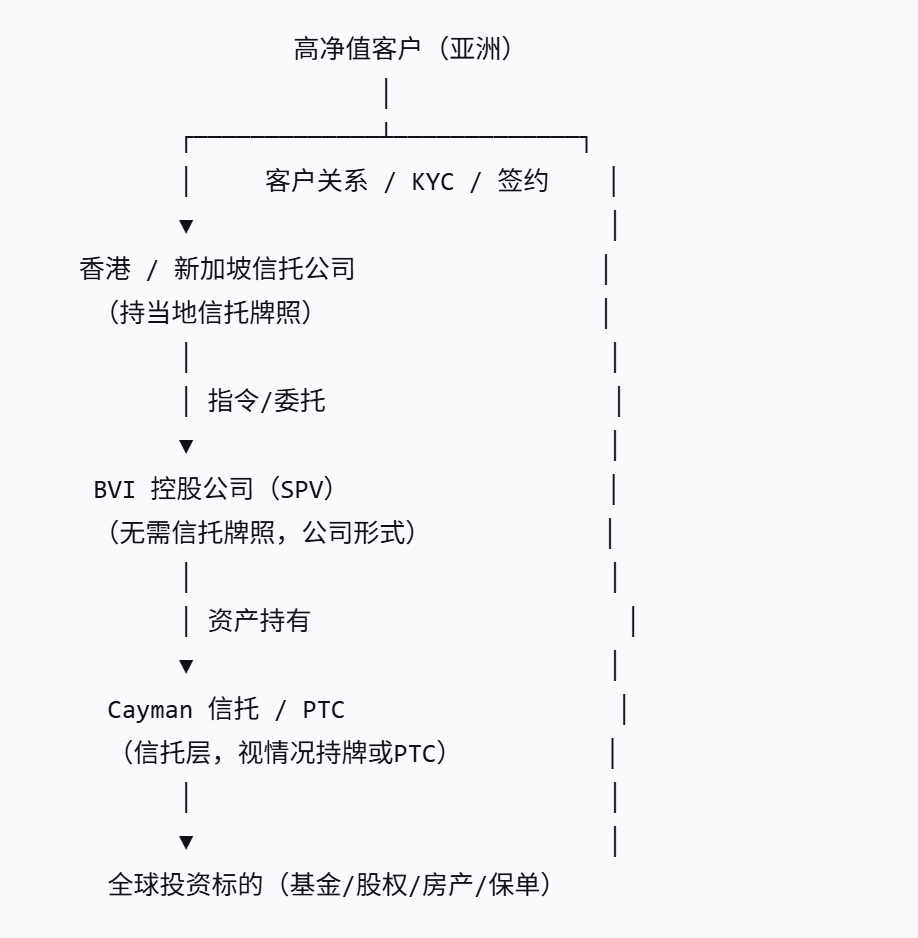 Specifically, in this structure, BVI companies typically do not hold trust licenses but are used as SPVs in the form of private companies. The actual trust legal relationship is established at the Cayman level, fully isolating the operational risks of the BVI company layer.