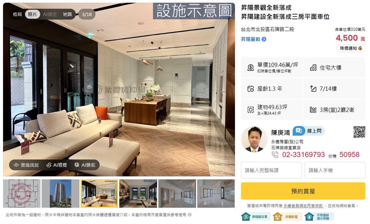 I casually found an ad online; a new property of about 165 square meters (1 ping = 3.3 square meters) costs 1.5 million US dollars, approximately 10 million Chinese yuan.