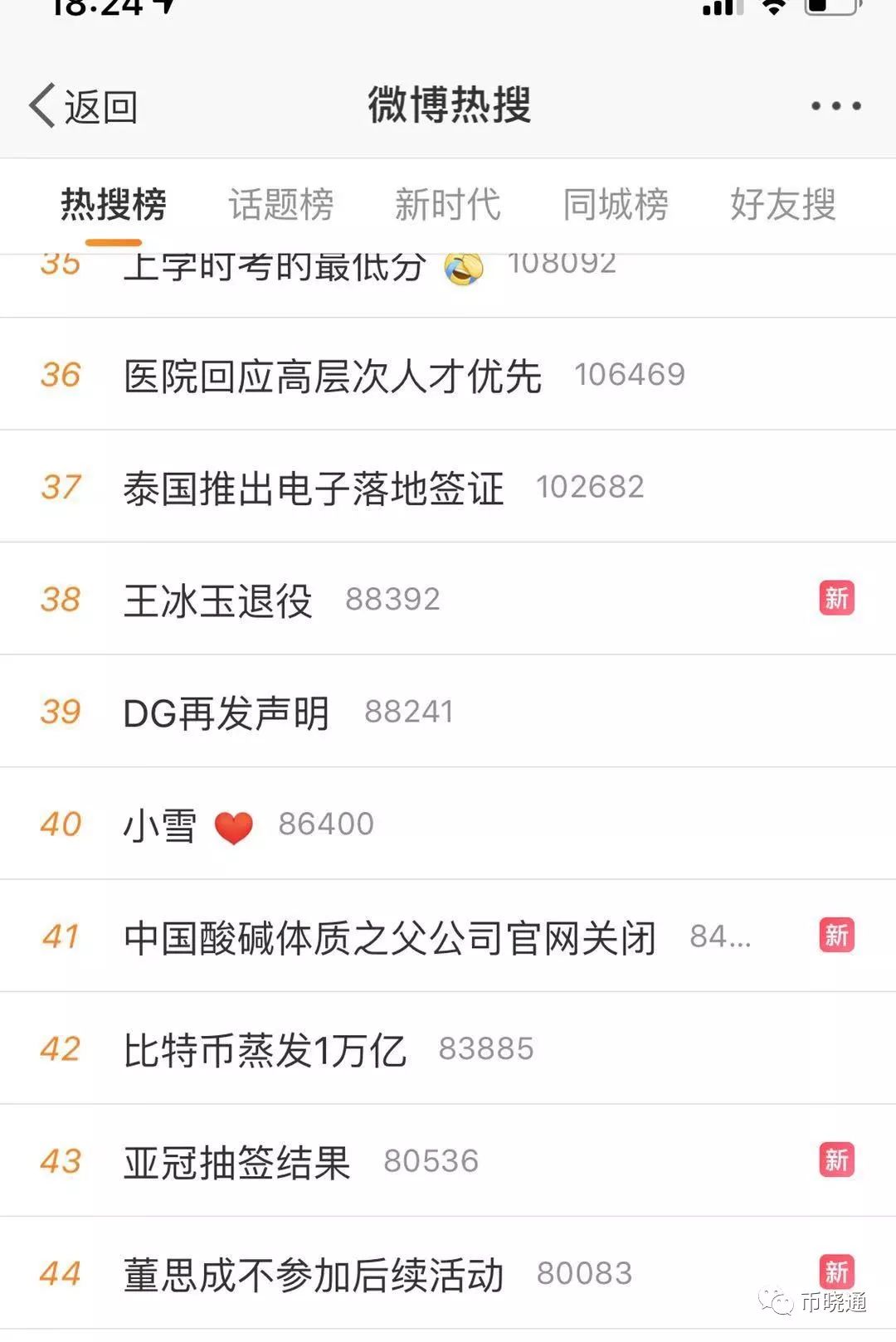 最后再看看百度热搜和微博热搜,暴跌成了热点事件,百度热点更是超越了昨天的dg事件,这会不会小题大做了,币圈就那么点人数,点击率可以甚至超越dg热点,如果情况真是这样,那么说明币圈人气还在,人流以及资金都在等待,如果不是,那么这背后肯定是庄家大户制造的烟雾弹了。