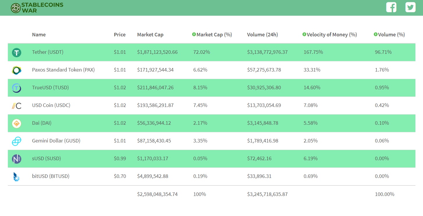Competition among stablecoins has given rise to dedicated tracking services. A new website, Stablecoinswar.com, provides data about their price, market capitalization, daily trading volume, and share of total volume. It also has a “velocity of money” indicator that reflects the rate at which each coin is exchanged – in other words, the speed of circulation. The platform currently lists eight stablecoins: tether, paxos, trueusd (TUSD), USD coin (USDC), dai, gemini dollar (GUSD), susd, and bitusd.